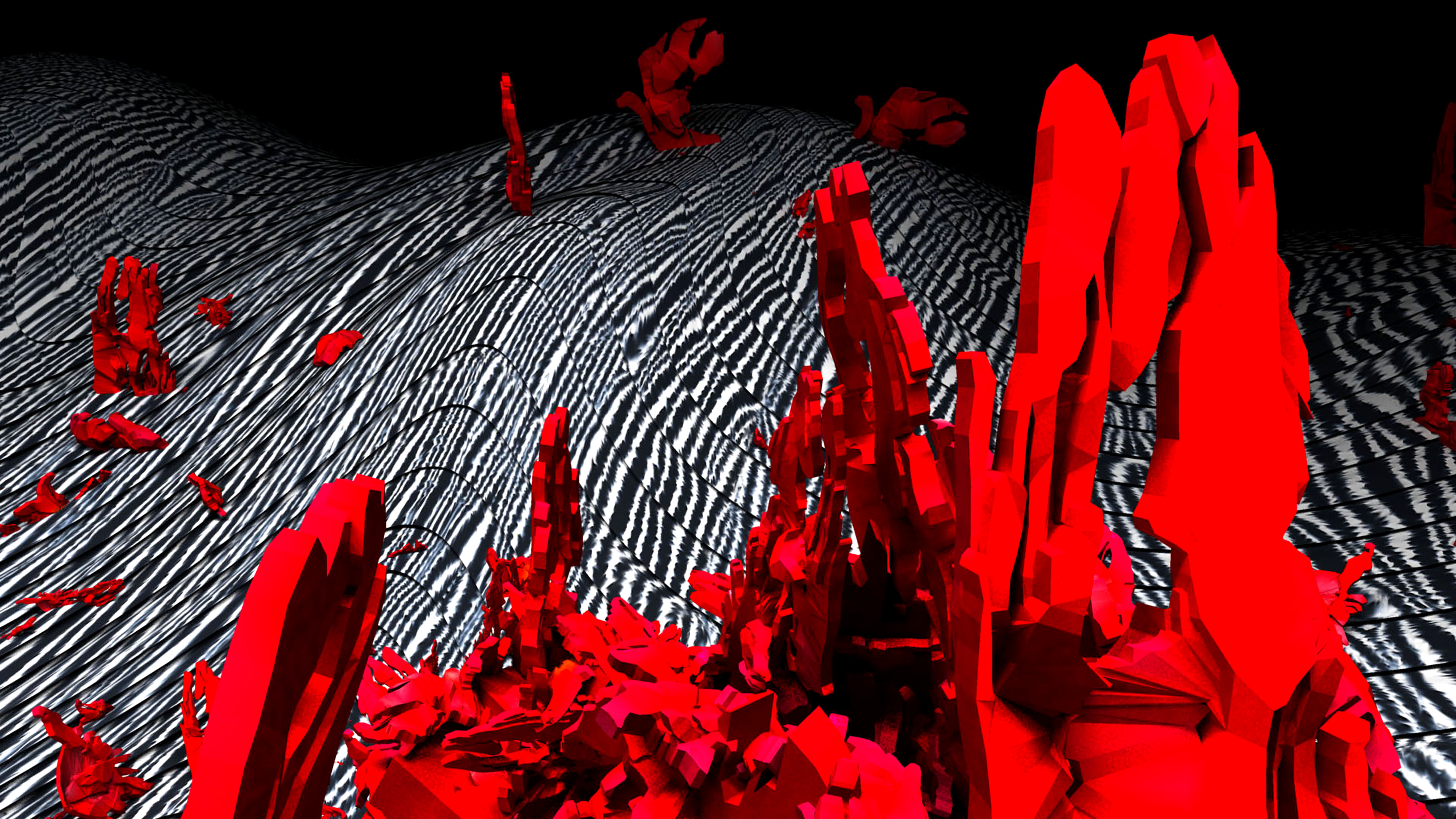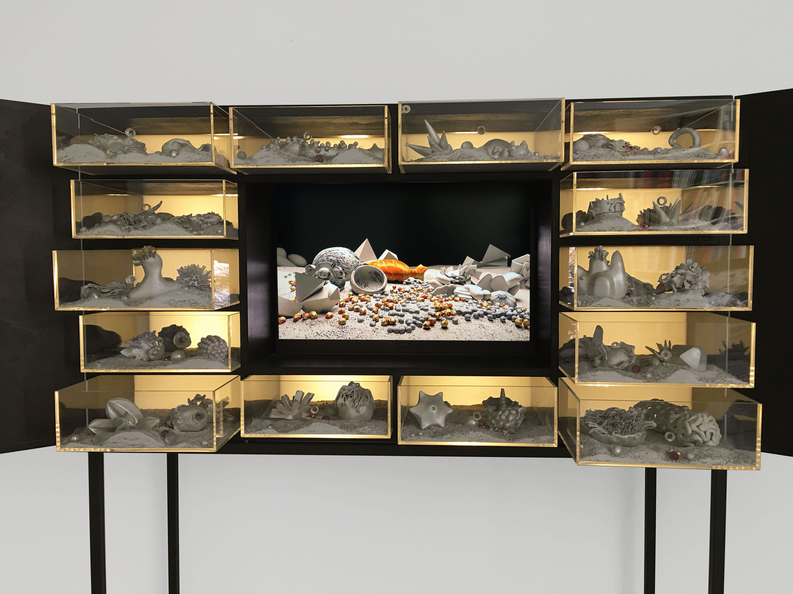 «Ostinata e appassionante. Estrarre il visibile dall’invisibile. L’ho detto più volte: lavoro alla materia come un archeologo nel sottosuolo. Attraverso immagini in nanoscala ho accesso a mondi e forme fino a qualche tempo fa imperscrutabili. Mi interessa la correlazione tra la visione degli elementi e delle strutture contenute nella materia e quella delle cose che mi circondano. Entrambe sono realtà, entrambe sono illusione. La nostra percezione del mondo e quella di noi stessi appare, probabilmente, come spiega Carlo Rovelli, un’allucinazione confermata. M’interessa il sensibile campo immaginifico che si crea intorno all’invisibile. Attingo alle informazioni della scienza e, in seguito, attraverso l’uso della computer grafica, elaboro le forme e creo mondi paralleli. L’animazione 3D rappresenta per me un potenziale mezzo di sintesi delle arti. Un’altra mia caratteristica è quella di creare relazioni tra l’elemento virtuale e quello tradizionale utilizzando, ad esempio, l’argilla o la pittura accanto al digitale. Lo confermano le mie wunderkammer dove oggetti animati provenienti dal nanomondo dialogano con elementi di forma similare modellati a mano in creta cruda che, come forme germinali, trovano posto nei cassetti dello stipo. Un procedimento d’ibridazione caratterizza anche gli screen painting, tecnica da me inventata, che coniuga la pittura applicata direttamente su monitor con le immagini digitali in 3D che scorrono sullo schermo creando un percorso imprevedibile. I due elementi sono progettati per coesistere e completarsi l’uno con l’altro; la loro combinazione non è affatto casuale».