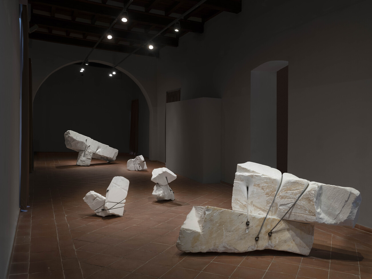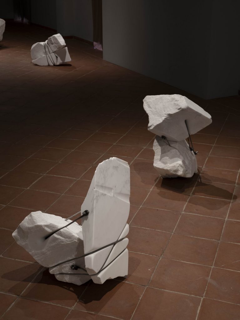 La mostra, curata da Christopher Atamian e Tamar Hovsepian per Atamian Hovsepian Curatorial Practice, si presenta come un intervento unitario e site-specific concepito in stretta relazione con il contesto carrarese, dove l’artista ha recentemente aperto il proprio studio. Cinque sculture in marmo, dieci blocchi bianchi uniti a due a due che mostrano tutto il loro peso e insieme la loro forza, legati da cavi d’acciaio che li attraversano e li serrano. Il metallo e il marmo li rendono apparentemente freddi, eppure la loro superficie sembra morbida, quasi viva, costretta a stare insieme dalle funi che incidono la pietra come corde che scavano nella carne. I solchi raccontano una resistenza, per mantenerli uniti il metallo deve penetrare e stringere. Eppure, alla fine, la leggerezza prende il sopravvento, i blocchi paiono fluttuare, accettando il loro destino, la loro condizione di unione forzata.