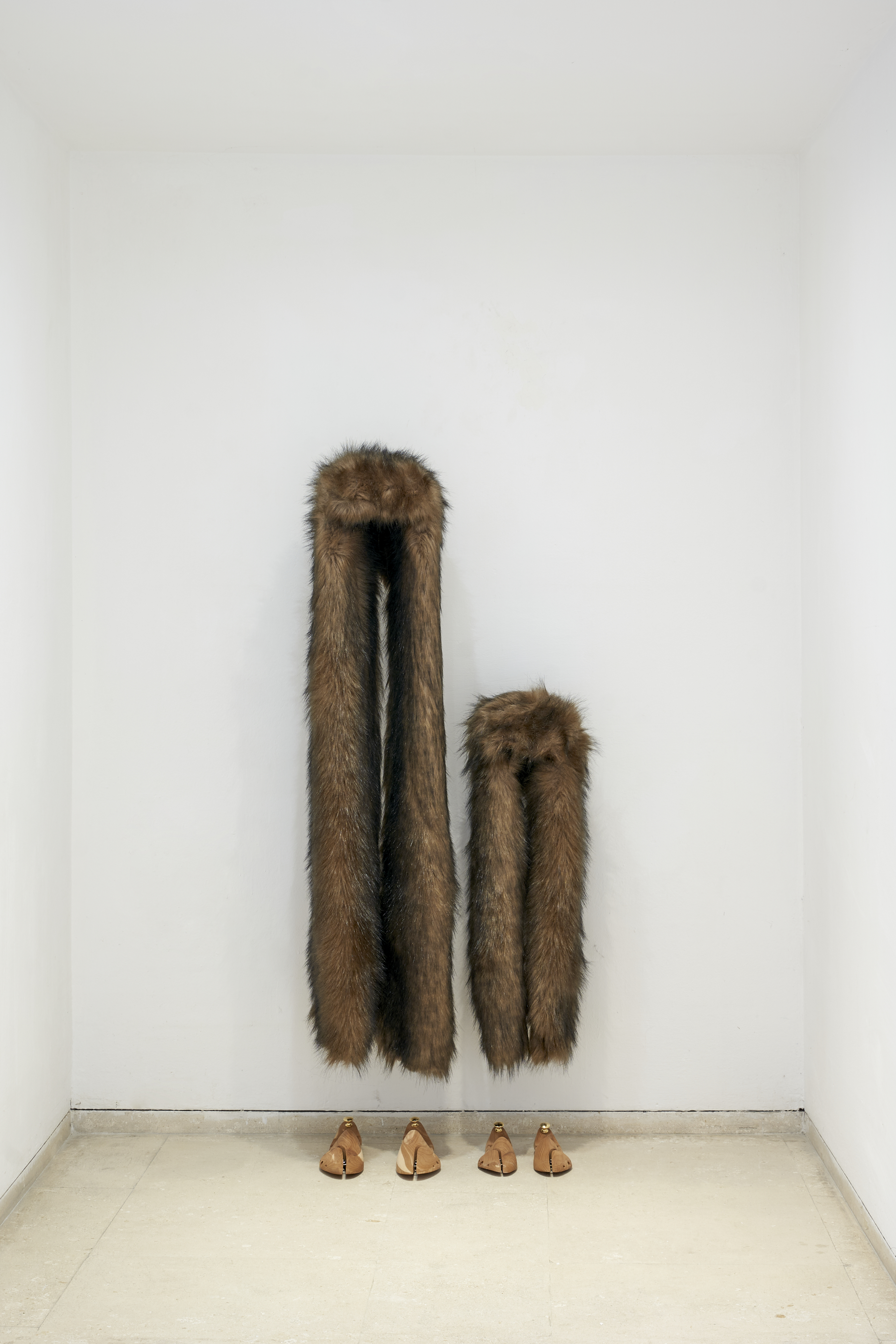 «La pelliccia sintetica è uno di quei materiali che mi attira e che uso da molto tempo, sia per le sue qualità visive/tattili che concettuali. Oltre alla connotazione infantile e giocattolosa, è interessante la fissazione umana nel ricreare le cose pur di averle, anche se finte. Questo materiale è stato ed è tuttora strumentale contro la caccia agli animali e al contempo solleva parecchie questioni sulle problematiche ambientali, come accade anche per altri materiali che si disperdono in microplastiche. Le pellicce in mostra sono tutte scarti di produzione forniti grazie a Mattia Varini e all’azienda Confezioni Grazia di Brescia, che si occupa di produzione di abbigliamento, dunque, queste pellicce derivano e dialogano direttamente con l’ambito della moda. Nel lavoro Wheelbarrow, oltre all’immediata connotazione della pelliccia come status symbol, mi interessava anche la trasformazione qualitativa del materiale in cui la carriola non ha una struttura interna e mantiene la forma solo grazie ai fili da marionetta, aprendo una parentesi sui ruoli degli status symbol come trucchi che tutti conosciamo ma in cui comunque caschiamo lo stesso. In If you haven’t got it in your head you’ve got it in your heels, i colbacchi sono pezzi indossabili con un potenziale performativo, che in questo caso si trovano bloccati in una figurazione pseudo-teatrale che mantiene il racconto attraverso l’assenza del corpo vero. Nella sedia Donor’s seat la funzione viene amplificata fino a risultare assurda, estendendo i braccioli con cui poter donare ancora più sangue. Morbida e calda, quasi morbosamente sessuale, mantiene il donatore comodo davanti alla proiezione del video, ignorante del fatto che il liquido nella testa del Minosaur potrebbe essere quello donato da lui. Il pelo finto diventa quindi una specie di seduttore attraverso il percorso espositivo che, come un peluche dell’infanzia, accompagna l’individuo a familiarizzare con gli oscillamenti tra l’animale, il giocattolo, l’innocente, il colpevole, il kitsch, il primordiale, gli status symbol, il perverso, etc…».