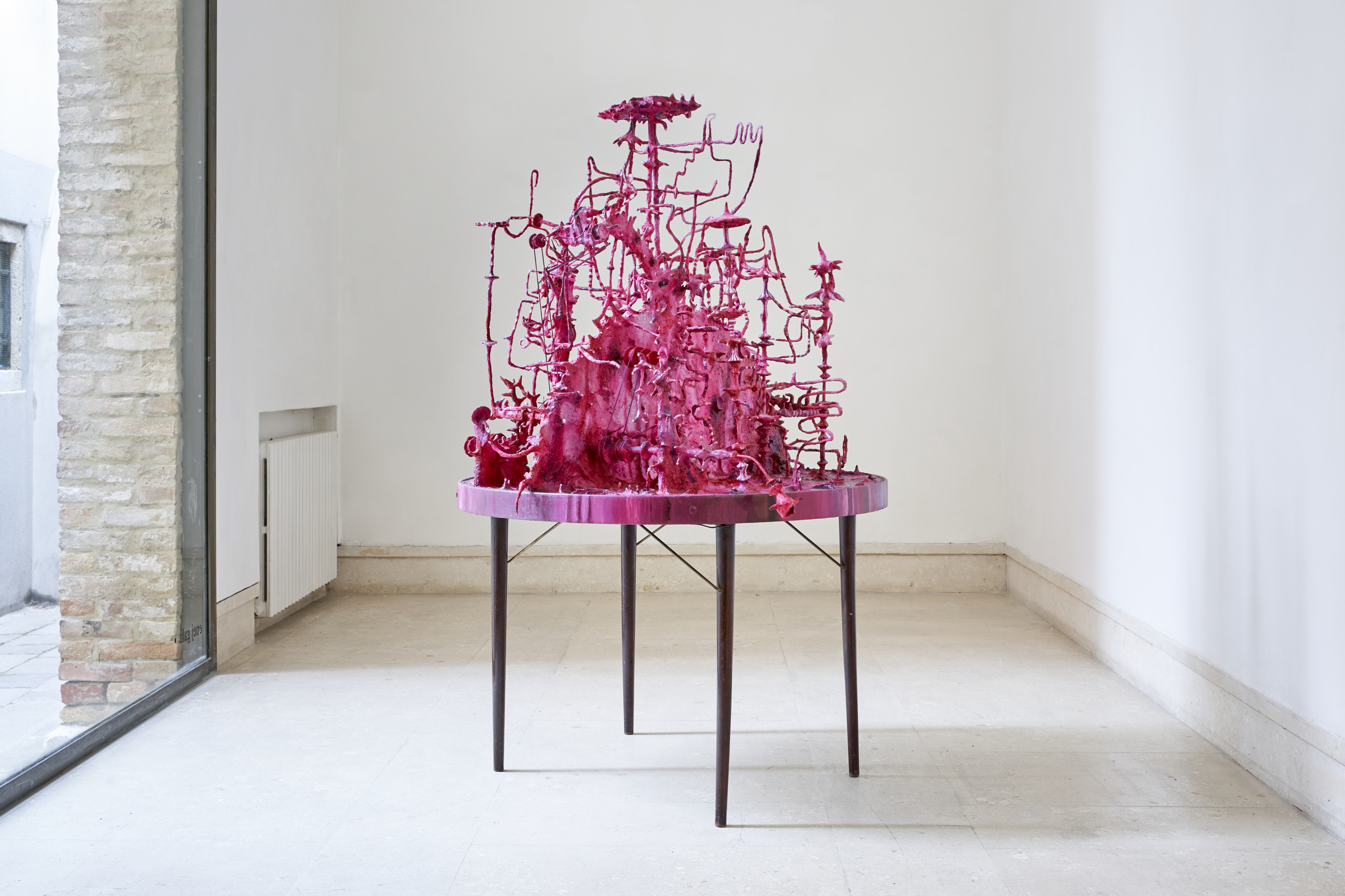 «L’idea era quella di un lavoro gemello ma separabile dal Round table, un close up di un possibile svolgimento all’interno del tavolo, in cui una marionetta si avventura come un insetto all’interno di un fiore per prenderne il nettare. Il fiore risulta carnivoro e il nettare, come l’acido digestivo, mantiene il Minosaur imprigionato nell’infinita fuga dal labirinto. In questo modo, il labirinto si nutre dei movimenti imprevedibili della marionetta, continuando a illuderla ogni volta che il liquido cade dalla sua testa, ritrovandosi con una dose dello stesso che cola fino a riempirla, ri-azionando il suo percorso da capo. Minosaur è una creatura ambigua, non davvero definibile, frenetica, senza sesso, spoglia fino le ossa, bianca come la carta che pian piano si sporca del liquido di cui rimane succube. Un po’ fa pena, un po’ schifo; e forse proprio perché non vuole rappresentare nessuno, in una maniera anche un po’ perversa, mi sembra un ottimo esponente dell’essere umano, che negli ultimi anni è rimasto intrappolato in varie misure restrittive. Filmato nell’estate 2021, è il lavoro che ha unito in collaborazione il videomaker Fabris Šulin e il musicista Tomi Novak. Il motivo archetipico attraverso cui ho unito i due miti greci Minotauro e Sisifo attraverso le letture di Richard Teschner (sulle poetiche fabbricazioni dei suoi mondi teatrali) e sotto l’influente perspicacia di Octavia Butler (nel descrivere la psicologia umana/aliena), si presta a fornire una vita parallela al piccolo mondo distopico installato sopra al tavolo rotondo. Il video e il tavolo sono i primi lavori che avevo pensato per la mostra intorno ai quali tutti gli altri si sono formati al ritmo ansiolitico del ticchettio ipnotico, più veloce e meno preciso dell’orologio artificiale, che accompagna il video e ridonda attraverso tutto lo spazio».