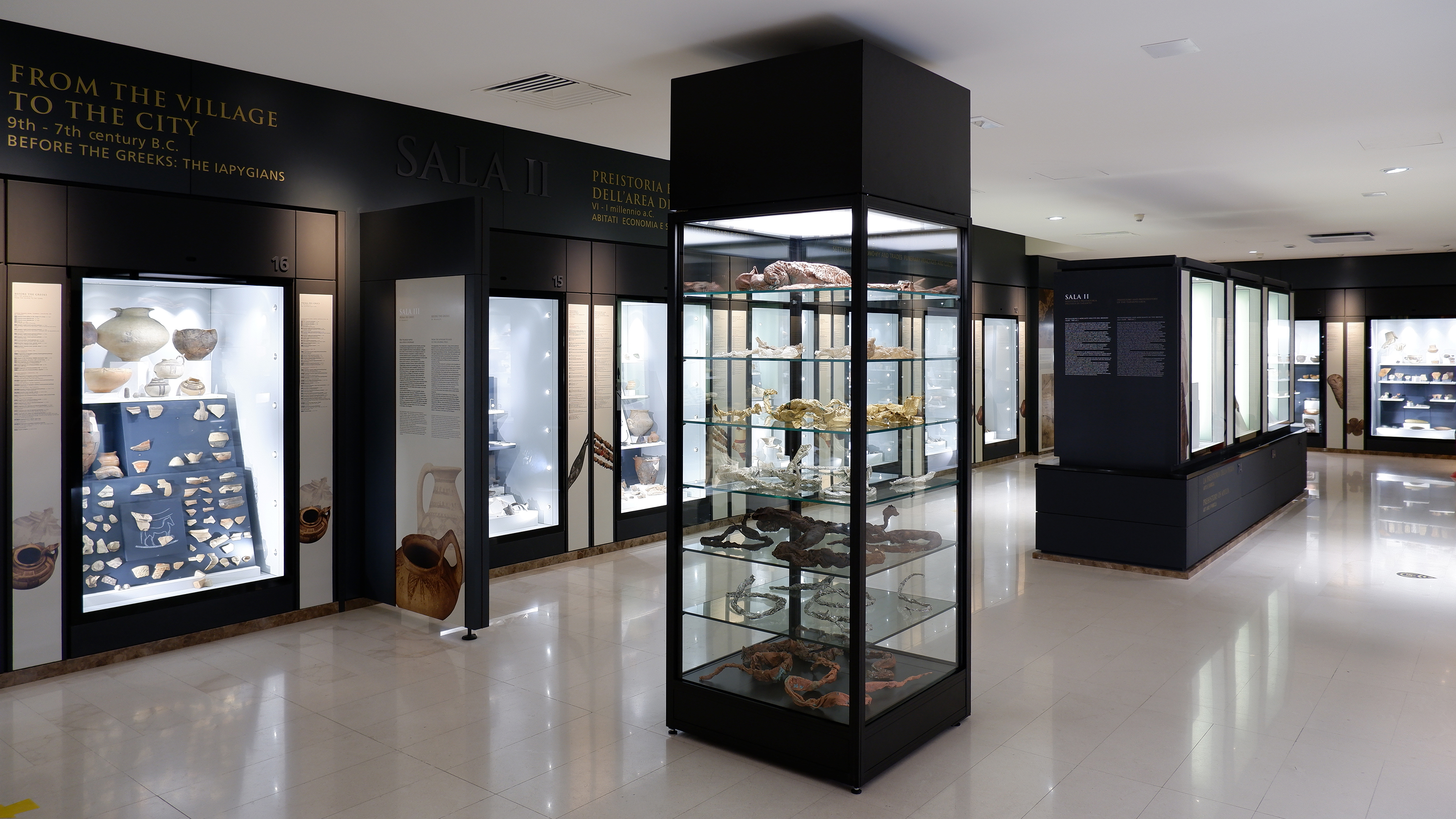 “L’Età dell’Oro (la muta)” non è solo il titolo della mostra, ma anche dell’opera site-specific realizzata da Federico Gori al MArTA di Taranto. È un pensiero, una speranza, un rituale. All’interno di una vetrina, su più livelli di vetro trasparente, sono racchiuse 28 esuvie di diversi serpenti: l’opera “L’età dell’oro”. Le pelli ricoperte in oro, argento, bronzo, rame e ferro sono, in parte, la traduzione materiale dei testi descrittivi de “Le Opere e i giorni” del poeta greco Esiodo. Così, dopo il trauma subito in tutto il mondo a causa dell’emergenza pandemica, quest’opera invita a riflettere sulla necessità di credere alla possibilità di stabilire un’armonia generale, una rinascita, finché, come auspicato da Virgilio, “tornerà l’età dell’oro”.