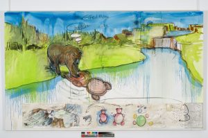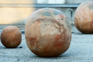In mezzo tra un lavoro e l’altro, pullulano forme germinanti che attraversano lo spazio e il tempo, formule matematiche, ampolle d’acqua, sfere d’argilla crepate e scolpite a mani nude da Bosco Sodi definite dalla gravità a confronto le immagini della cometa Churyumov-Gerasimeno conquistata da un robot Esa nel 2014. Incantano gli ambienti extraterrestri simulati studio BIG, le carte nautiche rudimentali e sofisticate delle isole Marshall realizzate con bastoni, fibre e conchiglie.