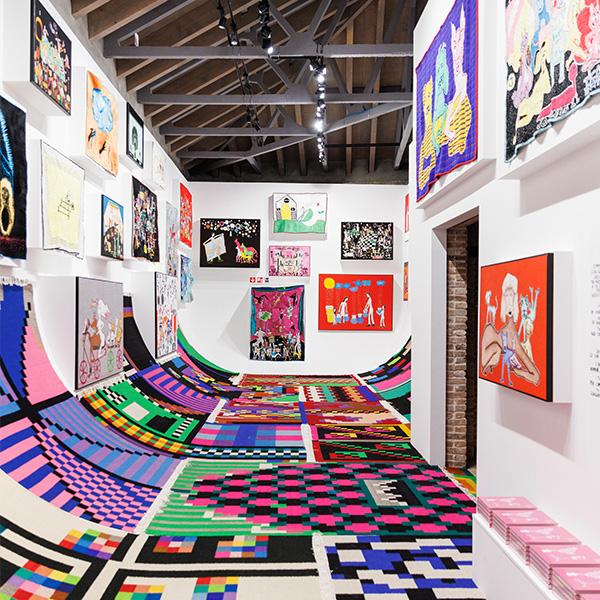 Posto alle spalle del celebratissimo Padiglione Ucraina, quello del Kosovo è davvero un antro seminascosto ma vitale e coloratissimo, uno spazio saturo di tappeti e dipinti con animali fantastici, non lontani dal linguaggio dei cartoons, con una interpretazione pop dai vasti e vivaci confini geografici e connotata culturalmente. Realizzata da Jakup Ferri, in collaborazione con artigiane dell’Albania, del Kosovo e del Burkina Faso, la produzione tessile per l’artista è infatti simbolo di creatività condivisa.