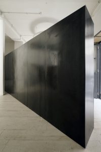 La fermezza dominativa della scultura longitudinale conduce alternatamente l’osservazione dal paradigma visivo a quello tattile, in una percezione contigua che interroga la materia, le sfumature cromatiche, le linee riflettenti di un’oscurità metallica ipnoticamente seduttiva, pur se invalicabile e inaccessibile.