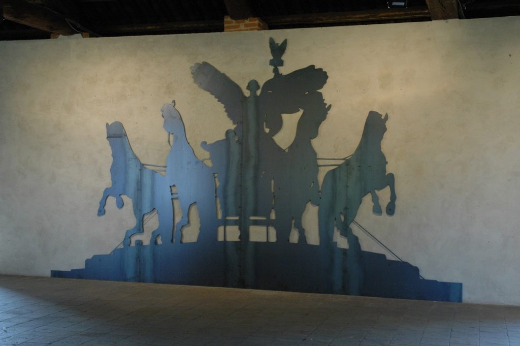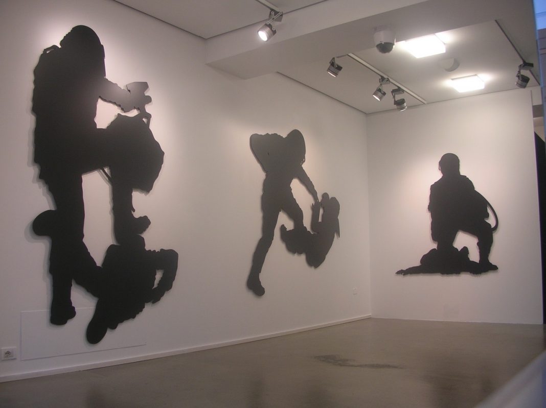 L’opera di Taioli si compone di una serie di sculture esposte a parete, costruite come ombre scure che si stagliano sui muri esterni di uno degli edifici di Flashback. Le figure evocano uno scenario di guerra e sono, quindi, immagini potenzialmente violente e intrise di un sentimento tragico. Eppure il loro effetto risulta fortemente attenuato e reso ambiguo dalla forma scelta dall’artista, che le rende simili a rigide silhouette di colore scuro, come ombre che ricordano a prima vista, per la struttura e la composizione, i celebri lavori di William Kentdrige.