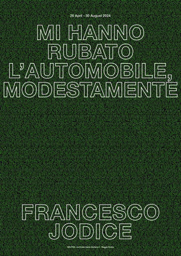 Camminando nell’androne di Neutro a Reggio Emilia si può incontrare il progetto di Francesco Jodice Mi hanno rubato l’automobile, modestamente. Viene subito in mente il progetto Laboratorio per telescopi che l’artista aveva sviluppato nel 2023 a Parma: lì si trattava del saper vedere, qui del saper leggere. Stese su un immaginifico terreno le frasi scorrono su righe minuscole: sentenze politiche, osservazioni antropologiche, riflessioni filosofiche, frasi poetiche… da Nanni Moretti a Nietzsche da Stendhal a Agamben da Calvino a Hitchcock, si susseguono senza soluzione di continuità.