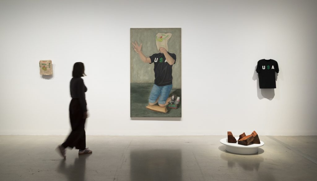 La mostra prosegue e si articola su tre piani al Chau Chak Wing Museum 一 parte del più ampio complesso della Sydney University e dedicato a collezioni di varia natura: dall’archeologia alle scienze naturali, dall’arte antica a quella moderna e contemporanea. Qui la riflessione, affrontata in chiave più leggibile, si concentra sui temi della provenienza, della restituzione, della memoria viziata dalla lente del colonialismo, sulla creazione di storie e narrazioni e sulla loro traduzione e trasmissione in chiave istituzionale. Protagonisti indiscussi di questa tappa, dove le opere convivono in delicato equilibrio con i reperti e i manufatti esistenti, sono il video Special Ops Cody di Michael Rakowitz, dove un soldato giocattolo fa irruzione in una teca museale per fare conoscenza dei suoi antichi abitanti, e la scultura Common Threads di Khalil Rabah, replica tessile di un mosaico bizantino rinvenuto durante lo scavo delle trincee della Seconda Battaglia di Gaza (1917) da una compagine di soldati australiani, rimosso in violazione della legge Ottomana e successivamente installato presso l’Australian War Memorial di Canberra, dove ancora oggi si trova.