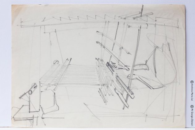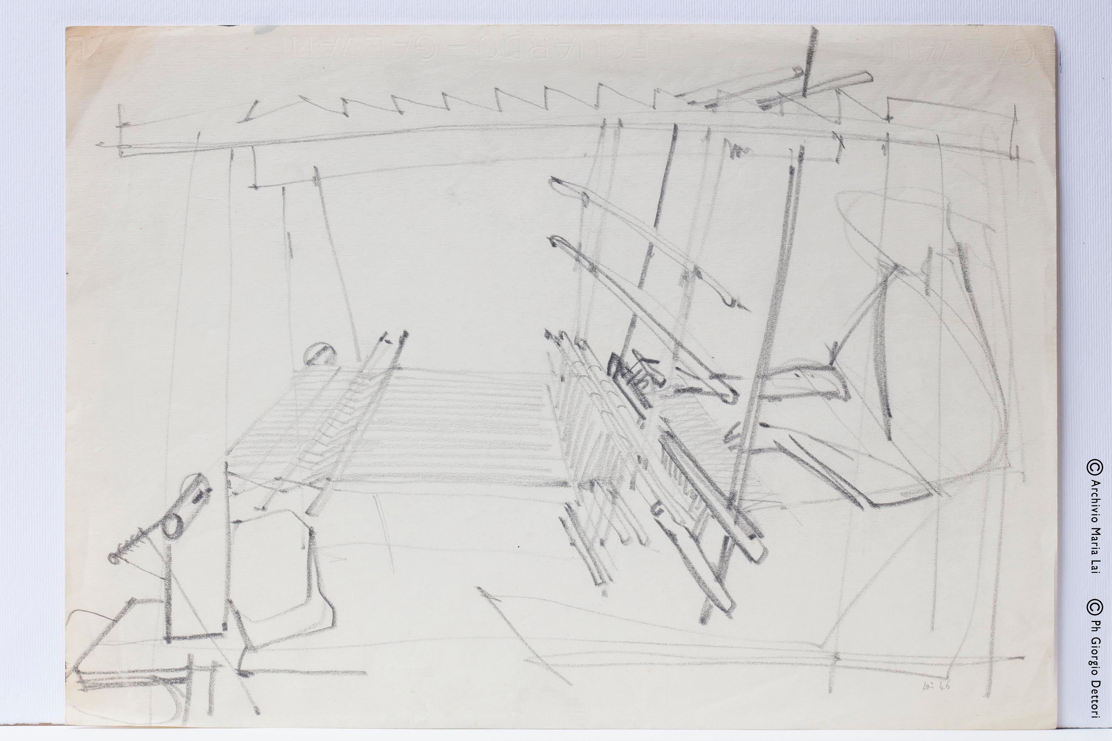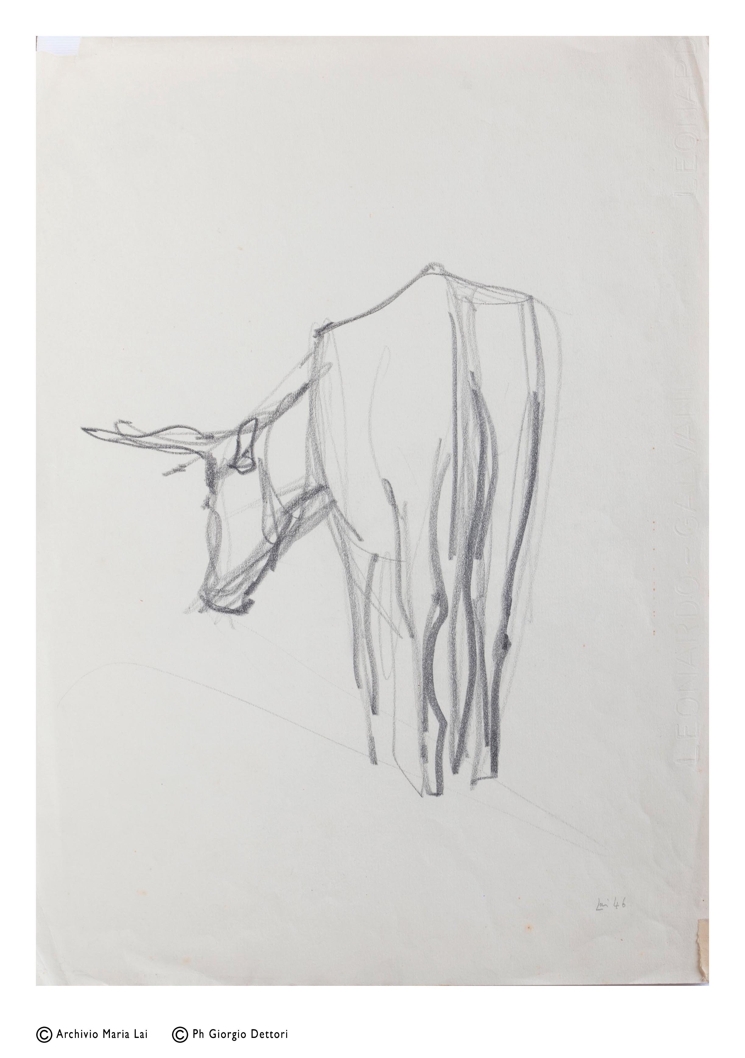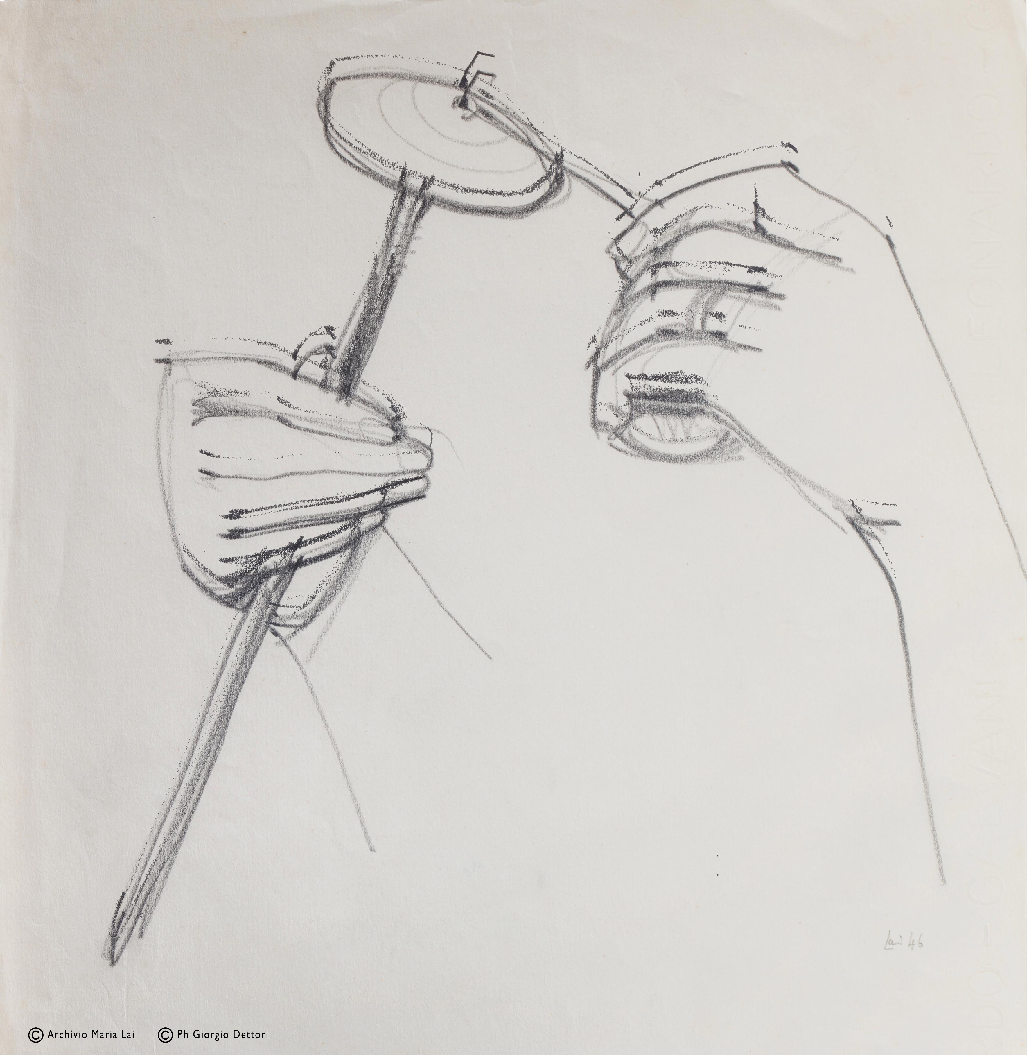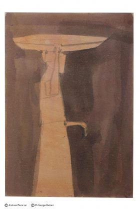 Il legame fra religione e tradizioni locali, in Sardegna, soprattutto nei paesi dell’entroterra è ancora oggi molto forte e la mostra racconta anche quello che per Lai è stato un altro dei temi fondamentali della sua ricerca artistica dagli anni Quaranta in poi: il lavoro degli uomini e delle donne, le fatiche quotidiane negli anni della Guerra e ancora una volta il legame con quel celebre “monumento ai caduti” mai realizzato e il “monumento ai vivi”, raccontati attraverso ritratti stilizzati e il tratto gestuale e istintivo che Lai esprimeva al meglio con i disegni a matita su carta, in alcuni casi colorati ad acquerello e china. E così gli uomini e le donne del paese diventano tipi umani, le tessitrici, le raccoglitrici di mandorle, l’aratro trainato da buoi, il pastore, le lavandaie al fiume, sono tutti monumenti. Ogni disegno è la celebrazione di quelle vite, lontane dalla nostra contemporaneità eppure abbastanza vicine da essere nella memoria collettiva. Tutte le opere rappresentano, in effetti, la dignità del lavoro manuale e fisico e delle vite più umili con cui Lai ha condiviso i primi anni della sua vita.