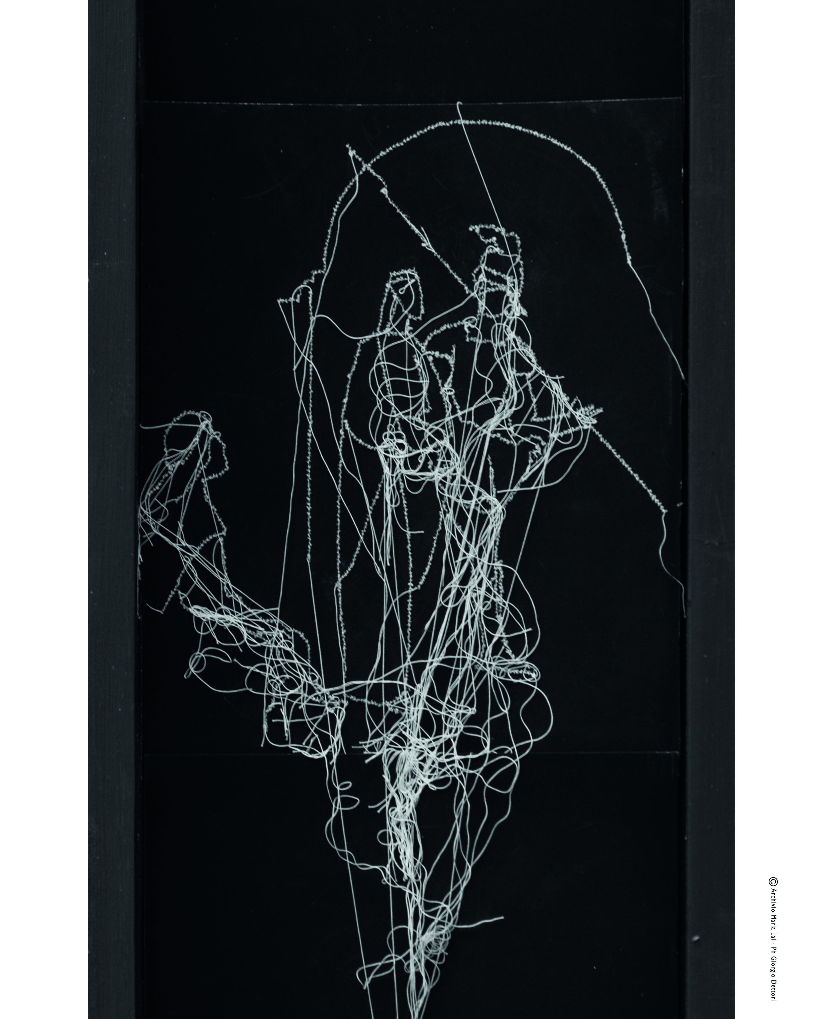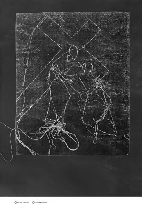 La Sindone, un lungo telo bianco su cui è cucita con filo color rame l’immagine del Cristo con la corona di spine è probabilmente l’opera tecnicamente più complessa dell’esposizione. La tela, lunga quasi tre metri, viene risolta dall’artista con una lunga e decisa linea che conduce lo sguardo in alto, dove chiude una corona, grumo di spine e grovigli di capelli che nascondono un volto, tutt’intorno fuggono cuciture impazzite, come scie di elettricità, figure triangolari che si disfano e ricompongono, spazio vuoto che ancora contiene energia e tutto il mistero della rinascita e della resurrezione.