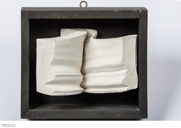 Il luttuoso sfondo delle opere, accompagna l’osservatore in un cammino soffocante, le cassette in legno nero, in cui le opere sono inquadrate, rimandano all’immagine di una bara, stretta e aperta, dove il corpo, esposto, è immobile e costretto.