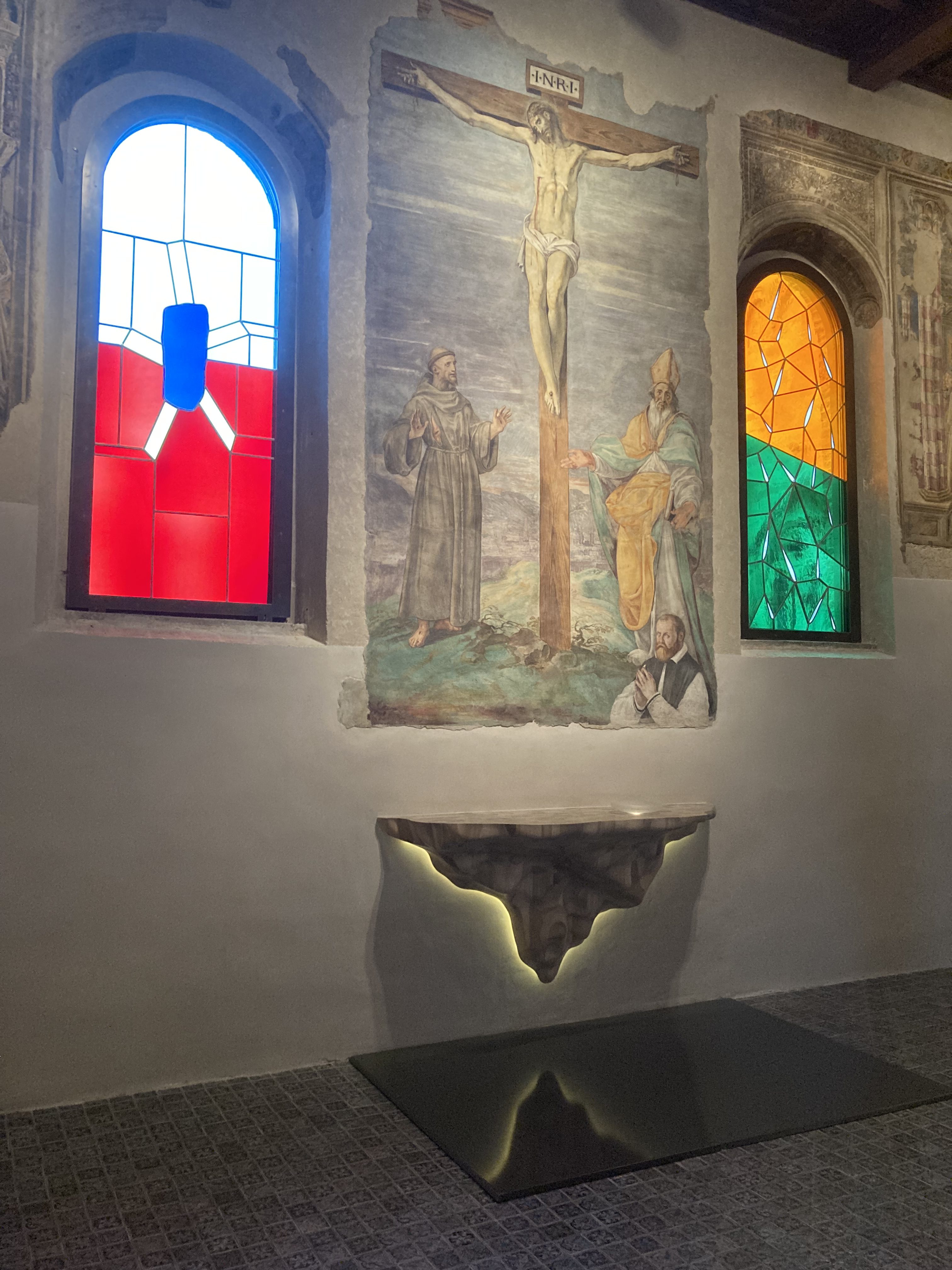 La flebile luce ne riflette la sagoma sul pannello scuro che idealmente delimita la base dell’altare: si crea così un sottile gioco di luci e ombre cui si sommano anche quelle colorate create dalle vetrate proiettate sul pavimento. Se un tempo questo luogo è stato simbolo della magnificenza del potere comunale, oggi, con la realizzazione di quest’altare funzionale alla liturgia cattolica, si carica di sacralità uno spazio laico che diventa il nuovo fulcro del Palazzo dei Priori.