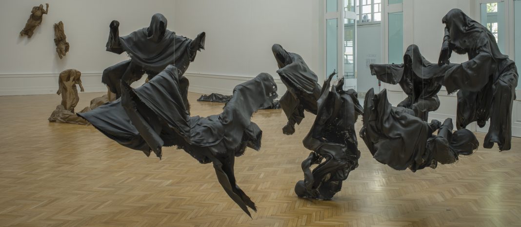 «Le opere sono state esposte alla Galleria Castelli di New York in due diverse personali MOLTINGSEXOSKELETONSSHROUDSnel 2015 e Boustrophedons nel 2017. Le prime realizzate in tela di lino belga immersa in un bagno di resina epossidica trasparente e le seconde in fibra di carbonio. In entrambe le mostre emergono espliciti riferimenti alla storia dell’arte: Goya, Rodin, Sluter… ma nelle sculture di Morris i corpi risultano assenti e la figura umana è suggerita unicamente tramite la suggestiva e sapiente modulazioni dei panneggi delle vesti che, irrigidendosi, divengono autoportanti quando le resine essiccano. In entrambe le serie l’artista allude all’esoscheletro trasparente di cui si liberano gli insetti al momento della muta ma anche ai sudari (shroud) che velano i defunti. Ne scaturisce una straniante e impossibile coesistenza fra vuoto e pieno che introduce nella visione un insolito e fertile corredo di sensazioni contrastanti, che ispira mutevoli stati d’animo in chi osserva. Muovendosi in uno spazio disseminato di figure a grandezza naturale, prive di ogni accenno di piedistallo che, a seconda della prospettiva dello sguardo, si mostrano come figure o come vuoti simulacri, lo spettatore non può più considerare l’opera al di fuori della sua stessa relazione percettiva. Morris riafferma così la stretta interdipendenza fra oggetto-osservatore-spazio, già operante nelle sue opere minimaliste. Sia che si trovino sospesi nel vuoto, aderenti alle pareti o semplicemente deposti a pavimento i recenti gruppi scultorei in mostra testimoniano inoltre il crescente interesse dell’artista per la figura umana e per l’opera di maestri del passato: un interesse che a partire dagli anni ottanta del novecento, segna una svolta anche nel suo vocabolario formale che pare orientarsi verso elementi barocchi e allegorici come negli hydrocal works bassorilievi derivanti da stampi di forme in argilla e gesso bianco di frammenti di corpi umani che evocano un sentimento di perdita e morte, temi che si ritrovano anche -sia pur modulati da una sorta dipietās–nelle opere in mostra. Un filo rosso unisce sottotraccia, concettualmente e tematicamente, molte opere dell’artista che possono risultare ad un primo sguardo anche formalmente diverse».