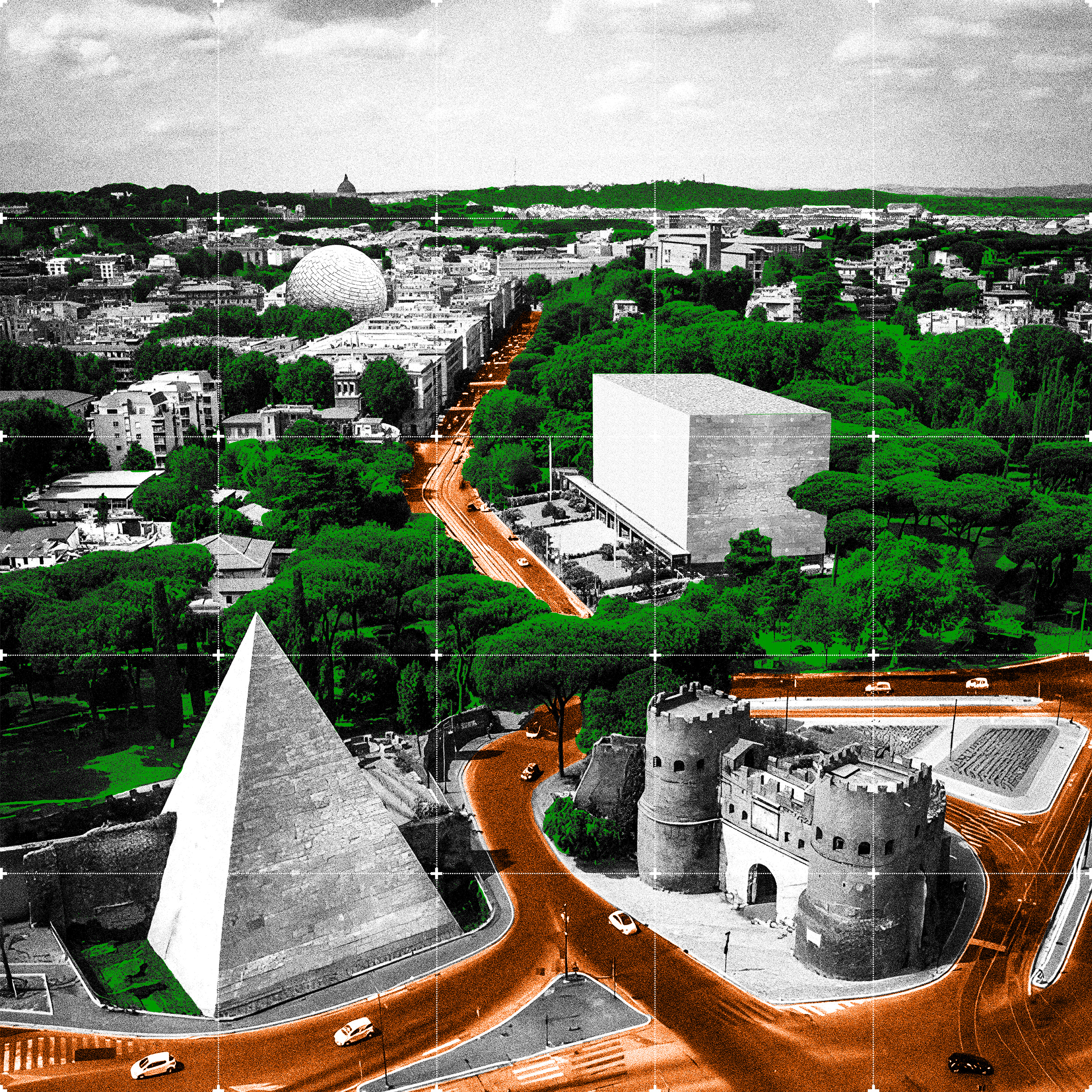 Poco distante, sulla storica porta romana di Porta Portese, incontriamo la porta del futuro di Giulio Bensasson e Michalski & Wagner. L’intervento appartiene ad un più ampio progetto espositivo, Le 10 porte del Futuro, diffuso sulle Mura Aureliane, ideato e curato da Spazio Taverna con la selezione degli studi di architettura a cura di WAR – Warehouse of Architecture Research e promosso da Roma Capitale in collaborazione con la Sovrintendenza Capitolina, Zètema e l’Assemblea Capitolina. Sulle dieci porte storiche della cinta delle Mura Aureliane sono collocati venti stendardi con opere che immaginano la Roma del XXI secolo, ideate da 10 artisti e 10 studi di architettura delle ultime generazioni. Un racconto en plein air di un volto più contemporaneo della città, stimolando le nuove generazioni ad attivare un rapporto costruttivo con il futuro della Capitale.