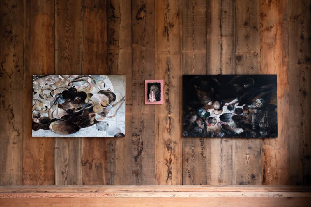 L’esposizione bipersonale Antropocene in Rumi appare perfettamente innestata nel luogo che la ospita. Le opere di Pasino, realizzate durante la sua residenza, sembrano assorbire il peso dell’aria: pitture in bilico tra apparizioni e dissoluzione. L’essere umano è reso fragile, frammentato, spesso sul punto di scomparire. Le figure del giovane artista si mescolano in una danza macabra, richiamando cicli perpetui di vita e morte e legandosi a filo doppio all’estetica del maestro Nicola Samorì.