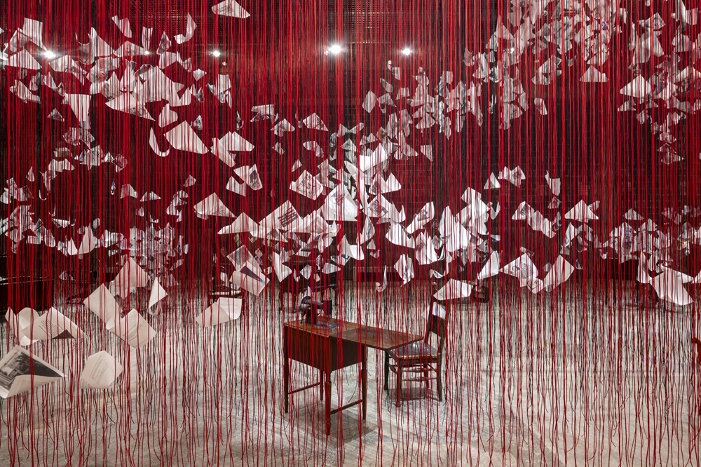Nel padiglione centrale, i fili rossi si diradano, lasciando lo spazio a un percorso che il visitatore deve ottenere tra ulteriori oggetti, mobili, elementi, ricostruzioni di esistenze che appartengono a qualcun altro. E infatti la seconda installazione, Home Less Home, è un’intera architettura simbolica di corde rosse e nere: un “non-luogo” che simula una casa, popolata da letti, tavoli, sedie, documenti, lettere, passaporti, racconti scritti a mano — eppure tutto sembra sul punto di smaterializzarsi. È una casa mentale, più che fisica, che tiene insieme memoria e precarietà, affetto e perdita.