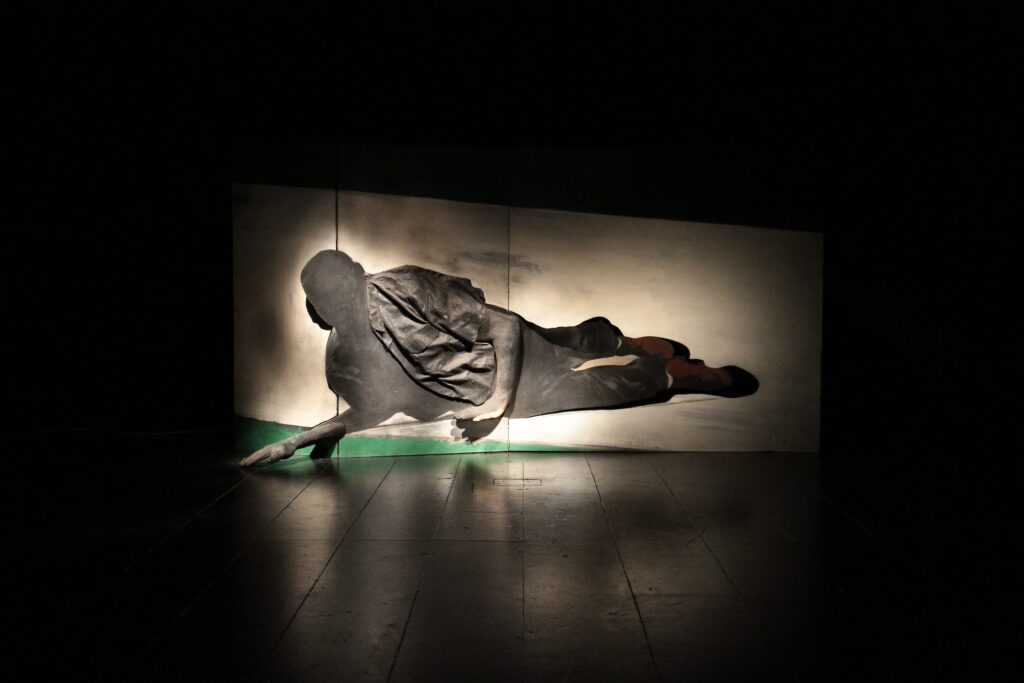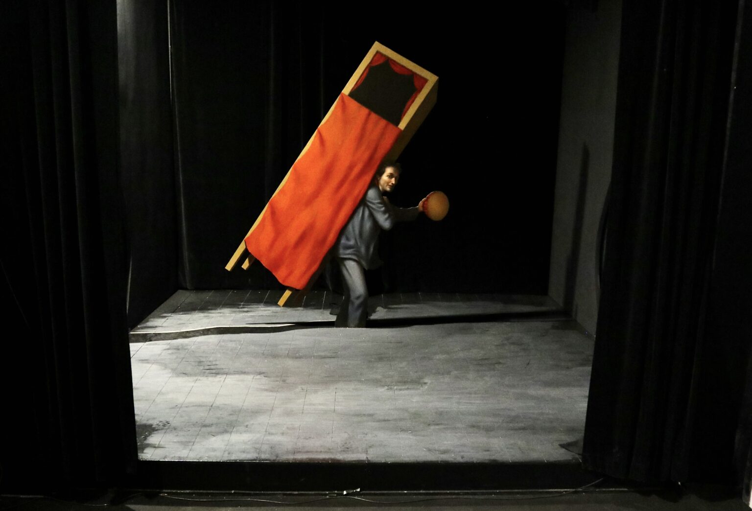 Una figura maschile è anche quella portata sul palco da Stefano Di Stasio (Napoli, 1948), tra i maestri del ritorno alla pittura negli anni Ottanta. È Gaetanaccio, maestro burattinaio romano di fine Ottocento. Con sguardo dolente e schiena curva trascina il suo piccolo teatro, detto il castello, salvandolo da una profonda crepa apertasi sul palco. Simile a un Cristo portacroce, che carica su di sé quello che poi sarebbe divenuto il simbolo della sua fede, allo stesso modo Gaetanaccio salva dalla rovina l’essenza stessa del teatro. La sagoma guarda il pubblico chiedendone complicità e solidarietà, fino a suscitare una riflessione profonda sul futuro delle arti.