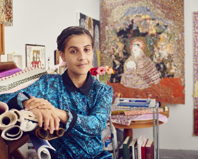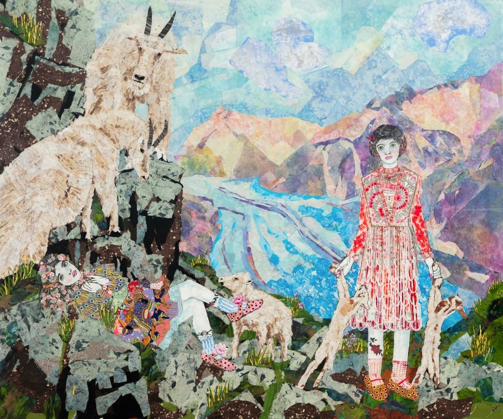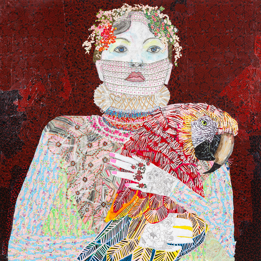 Maria Berrio è nata nel 1982 a Bogotà e, attualmente, vive e lavora a New York. Il suo originale processo creativo coinvolge varie tecniche come l’acquerello e la stampa su tessuto ma il materiale fondamentale dei suoi lavori è la carta. I fogli strappati sono incollati a strati sulla tela, celando una profondità materica pari a quella espressa dalle figure rappresentate.