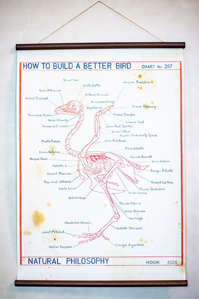 Una precisazione che tornerà utile: Dion nasce biologo, poi diventa artista con un salto di specie. Ha un fare tranquillo, e insieme a lui ci si diverte a commentare le tavole che illustrano classificazioni assurde, tipo How to build a better bird mettendoci tanti nomi di peso della cultura internazionale, da Carla Lonzi ad Hannah Arendt, da Walter Benjamin a Giorgio Agamben. In quella che definisce «Semplicità abbinata alla complessità» delle sue produzioni, Dion è micidiale. Pacioso nell’aspetto, un carrarmato nell’osservare la società contemporanea, evidenziando qua e là atteggiamenti maturati come riflessi incondizionati.