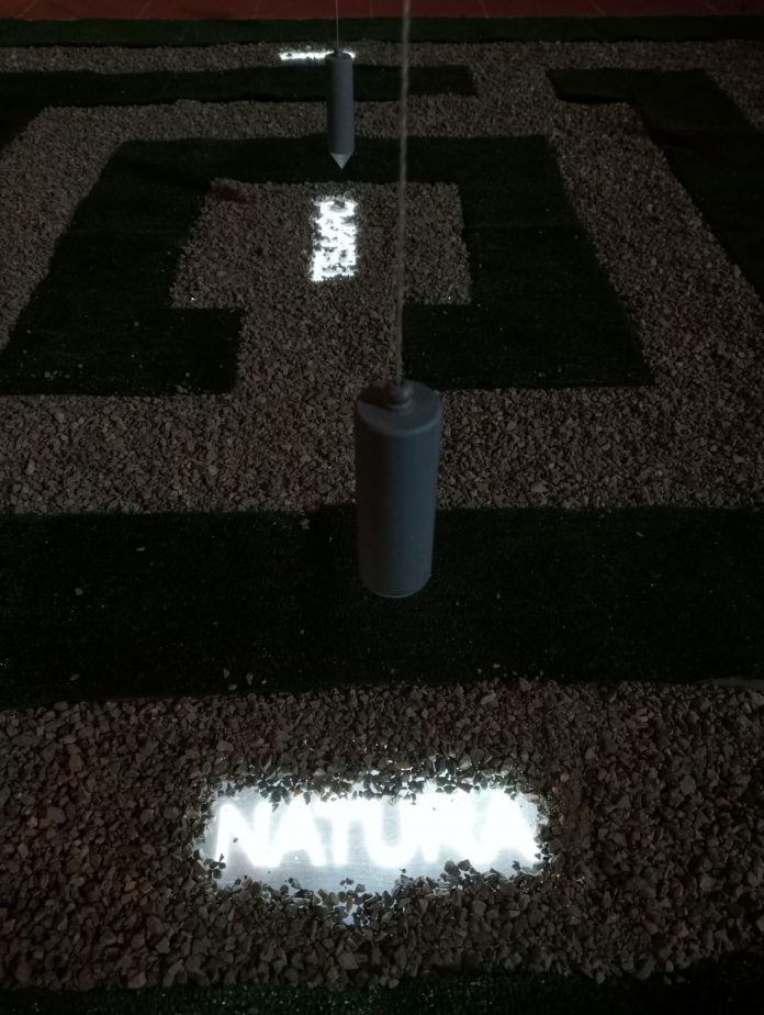 Più in basso, in una sala attigua, è posizionata Il Giardino dei sentieri che si biforcano, l’opera del 2017 di Ines Fontenla. Ispirata nel titolo e nel senso al celebre racconto di Borges, l’installazione è una riflessione sulla relatività tempo e sulle percezioni di esso nei diversi aspetti dell’universo. Come in Borges il tempo prende la forma di un labirinto, ad avvalorare l’impossibilità di definirne un andamento univoco. Il tema che l’artista ha approfondito attraverso letture e studi, l’ha portata a riflettere su quanto la percezione umana del tempo sia una parte di un tutto complesso, che porta oggi l’uomo ad osservare aspetti dell’universo che in questo stesso momento non sono più. Natura, Spazio, Uomo e Scienza sono i luoghi fisici e mentali che l’artista individua con pendoli calati dall’alto e che pone ai limiti di un immaginario percorso lungo quel labirinto al cui centro campeggia il Tempo, principale coordinata di percezione.