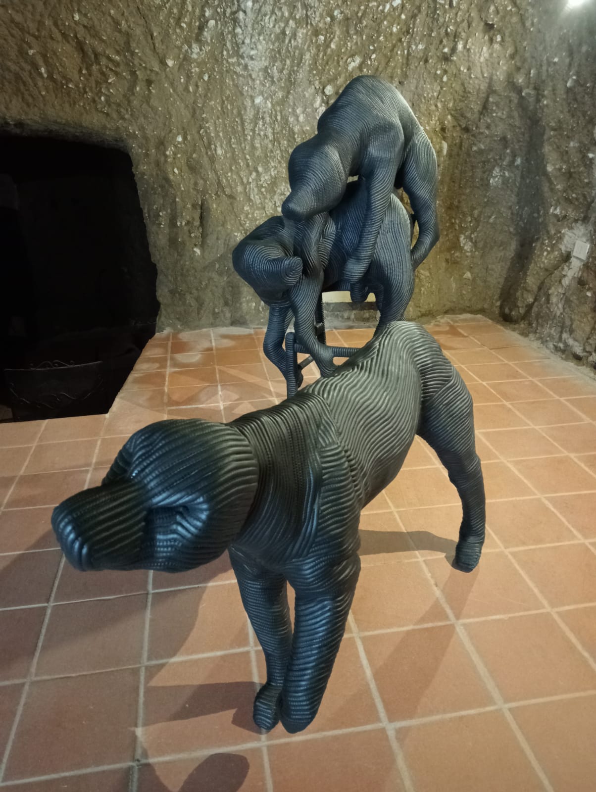 Ad accogliere il visitatore nello spazio.Ipogeo è Branco di Paolo Grassino. L’opera, del 2018, è parte di una monumentale installazione: assembramento di animali dalle sembianze di cani che si riappropriano e difendono un mucchio di sedie, ricordo di oggetti abbandonati dagli uomini. L’ispirazione per quest’opera nasce dai branchi di cani che invadono le città dell’India, bloccando il traffico e le attività umane. E proprio come un branco questi cani neri si calano a terra da sedie accatastate, mentre si avvinghiano su loro stessi e invadono lo spazio che liberamente occupano. L’artista non indugia nei dettagli anatomici, questi animali hanno perso gli organi di senso e ogni tipo di caratterizzazione fisica. È la postura a esprimere quell’atteggiamento di concitata difesa che è il fulcro centrale dell’opera, quell’istinto a riunirsi per difendere gli oggetti e i territori di cui si sono appropriati, in antitesi con l’uomo che disperde e abbandona.