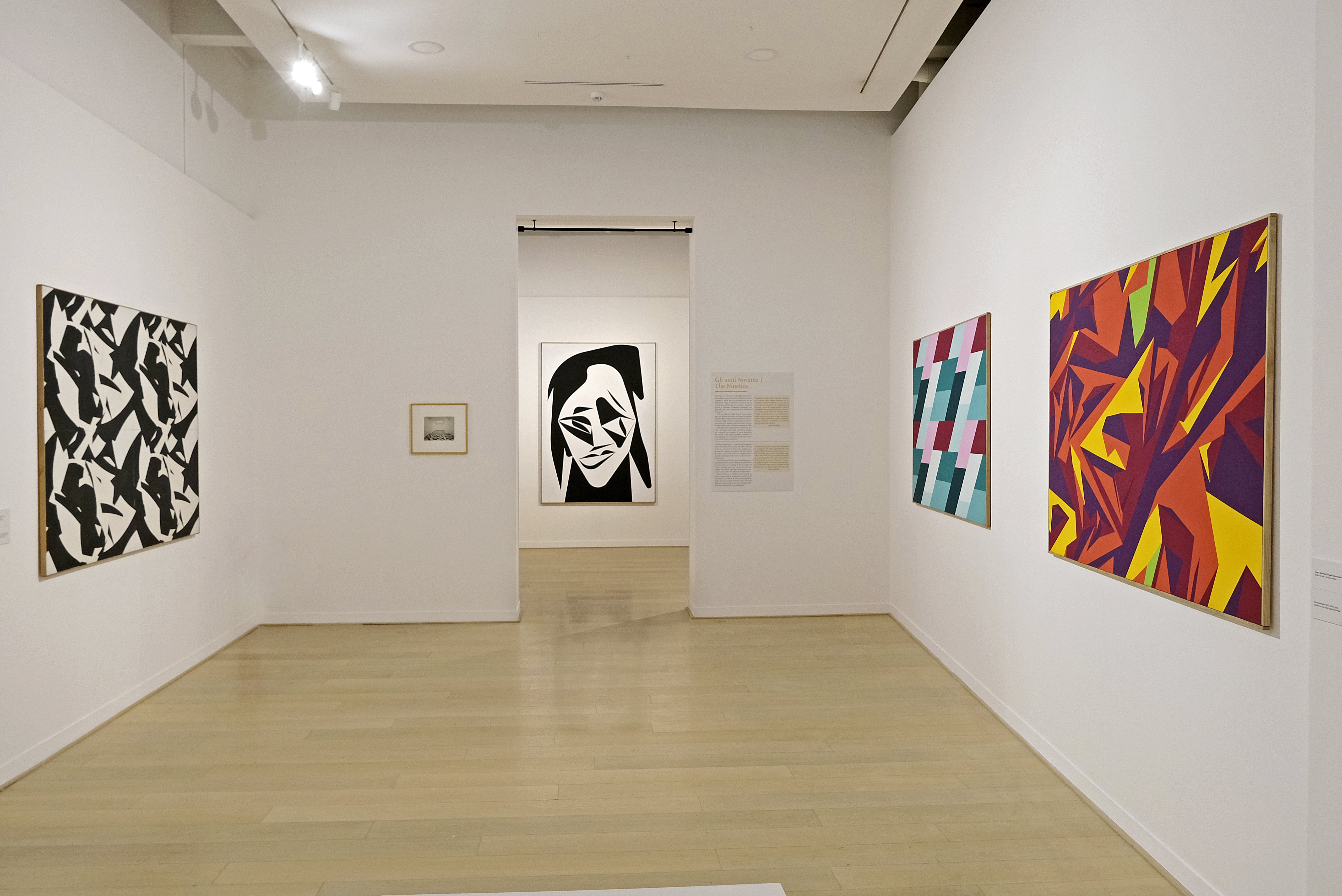 La mostra di Giovanni Frangi, Le mille vite di Showboat (che a Milano aveva avuto una prima, diversa, composizione al Castello Sforzesco), dialoga anche con quella di Sergio Lombardo tramite una balconata aperta ai Superquadri e alla Pittura Stocastica dell’artista romano. In questo spazio, sospeso e intermedio, Frangi presenta un’installazione luminosa e intima, di memoria cinematografica, che gioca con le ombre dei visitatori e con i ricordi dell’artista.