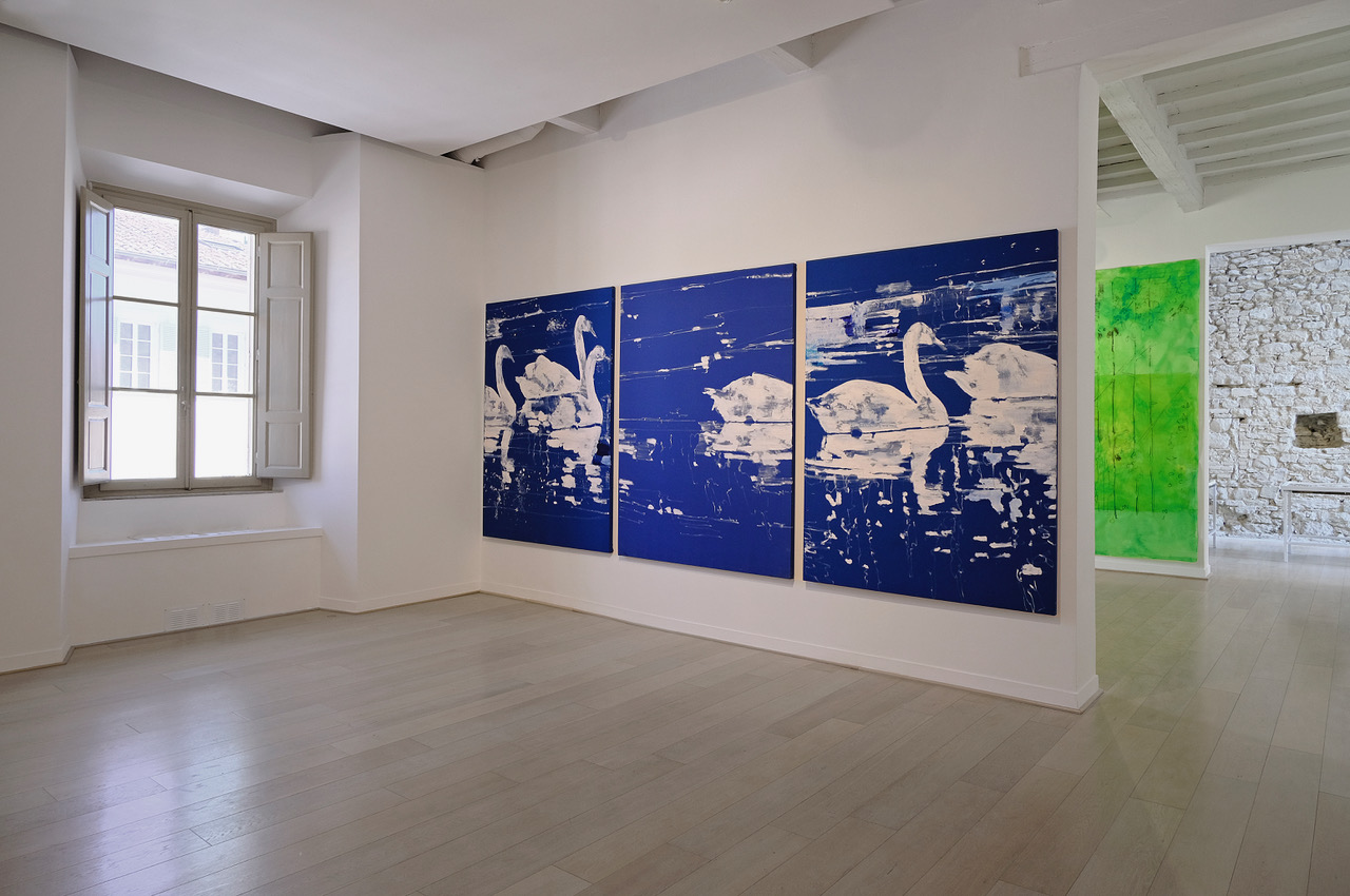 Si sale al secondo piano della Galleria Comunale d’Arte Moderna e Contemporanea di Arezzo per la personale di Giovanni Frangi, curata da Giovanni Agosti, che relaziona incisioni – dove appaiono pesci e acque marine – e olii su tela con gabbiani e cigni in movimento, memori delle scritture di Konrad Lorenz. E ancora un inedito e luminoso lavoro su carta da lucido con boschi e civette nascoste, che si ispira paesaggisticamente alle rupi del Casentino e al celebre dipinto di Bartolomeo della Gatta conservato alla Pinacoteca di Castiglion Fiorentino.