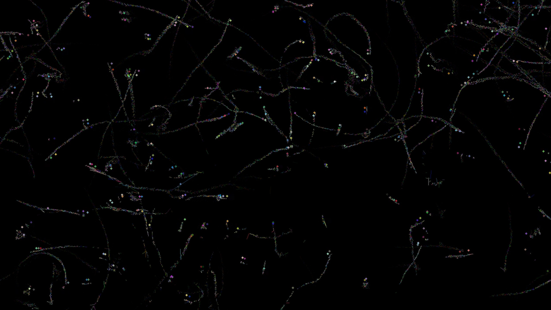 Il video di Jenna Sutela (1983, Finlandia) trova una collocazione particolarmente appropriata nel laboratorio didattico del Distretto del Navile, parte del Centro di Laboratorio per la Didattica Chimica (CILDIC), uno spazio caratterizzato dalla presenza di sofisticate strumentazioni scientifiche. Sui monitor è presentato nimiia cétii (2018), un lavoro “aperto” che documenta un sistema di intelligenza artificiale impegnato a osservare al microscopio alcuni batteri estremofili e a interpretarli attraverso segni dinamici ed enigmatici, simili a geroglifici in movimento, accompagnati da una voce che ne traduce i comportamenti in un linguaggio misterioso.