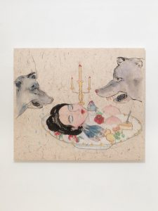 Un universo fiabesco e quotidiano insieme, che si mescola, capovolge e ribalta a ogni sguardo; favole con eroi, antagonisti e simpatici aiutanti in veste animale che rievocano le fiabe classiche e le audaci metamorfosi uomo-animale. Elemento fondamentale per entrare nella dimensione dell’artista è quello onirico: come nei sogni accadono cose che non è possibile decifrare e interpretare totalmente, allo stesso modo è possibile che elementi e dettagli contenuti nei lavori dell’artista ci restino per sempre sconosciuti, perché ogni più piccolo elemento del quadro sembra essere portatore di abissi intricati di significato. I lavori e la pittura “zuccherosa” di Shafei Xia sono portatori di significativi stimoli anche per il nostro gusto e olfatto, come l’artista stessa ama sottolineare rappresentando elementi del corpo maschile e femminile associati o posti vicino a elementi culinari.