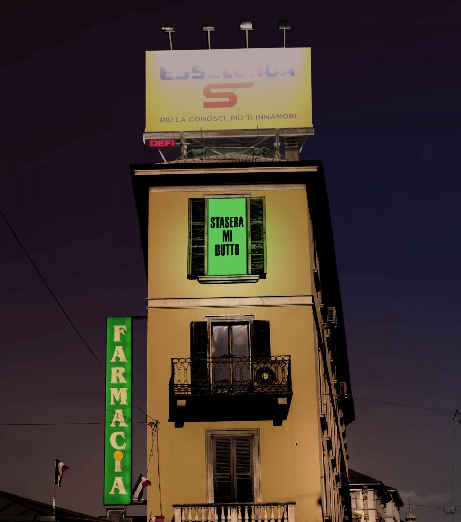 Frequentatori assidui e compulsivi della Milano Fashion Week, se vi trovate a passare tra Corso Buenos Aires e via Spallanzani, alzate lo sguardo verso una finestra al terzo piano, fate un respiro profondo e poi iniziate a cantare: STASERA MI BUTTO è l’installazione di SHITIMLOVINIT, pseudonimo dietro al quale si cela l’identità di un nuovo misterioso artista. Che per il suo debutto – sì, il gioco di parole era obbligatorio – non poteva scegliere luogo e occasione migliori, visto che Porta Venezia è ormai diventato il quartiere ufficialmente riconosciuto della movida – oltre che dell’arte, per esempio con le installazioni di Fondazione Trussardi – e in questi giorni sarà ancora più affollato e festante del solito. Insomma, ci vediamo tra l’Eppol e il Bar Picchio, con i cocktail a 4 euro che sono più una istigazione a delinquere che un’occasione di socialità.