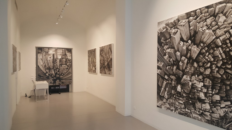 In passato il visitatore, dopo aver visto le opere esposte alle pareti delle gallerie, indossando un visore Oculus, poteva immergersi nella tela prendendo parte all’opera. Come catapultato sulla cima di un edificio, investito da un senso di vertigine reale, il protagonista vedeva la città animarsi attorno a sé: uccelli, gru, alberi ed ombre danzano in un delirio stupendo e vorticoso che è la città. Oggi invece, invece viene indagato e dato risalto al “passaggio”, il momento in cui la realtà analogia lascia il posto all’esperienza digitale. Un viaggio di mille miglia comincia con un primo passo e Giampietro inscena una mise en abyme, un avvicinamento progressivo verso l’opera d’arte, ma virtuale. Così il visitatore nei panni sia del flâneur che del situazionista una volta indossati gli occhiali potrà compiere qualche passo. Si avvicinerà alla tela fino a quando il suo naso sarà ad un millimetro dalla pelle della tela. E allora? Conosciamo tre dimensioni, ma qual è la quarta? Lucio Fontana la tela la tagliò per vedervi attraverso. Noi possiamo sporgerci e vedere ciò che sta al di là della superficie. Un nuovo modo di concepire l’arte e il senso di vertigine.