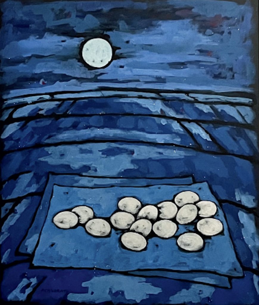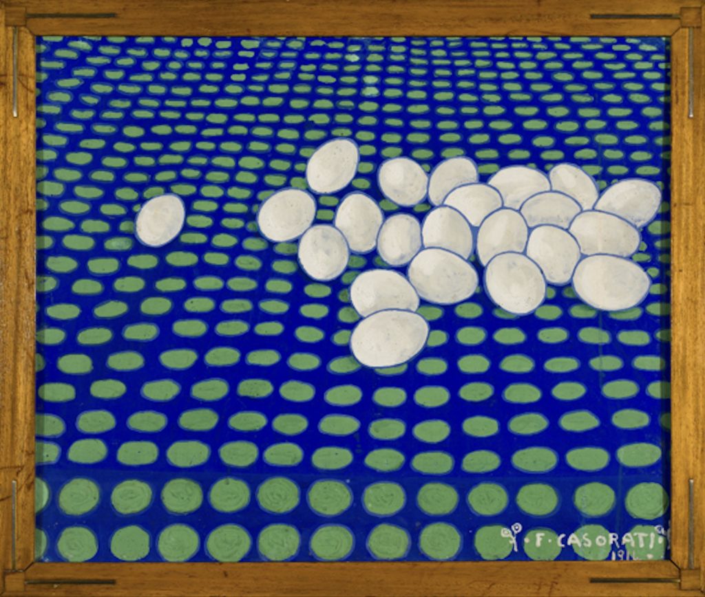 Felice Casorati, per esempio, ne dipinse tantissime: Scherzo uova, del 1914, è solo il primo di una lunga serie. Nel 1920 fu la volta di Uova sul cassettone, nel 1947 invece in Natura morta con l’elmo, accanto a due bianche e tondeggianti teste di manichino e un elmo, aggiunge due uova; nel 1950 con Uova e limoni o Limoni sul paesaggio fanno la loro comparsa dieci bianchissime uova e quattro limoni. E poi ci sono le Uova su fondo rosso, di qualche anno più tardi (1953) e, ancora, nel 1960 Uova nel paesaggio: 15 uova brillano in una notte azzurra e blu, illuminata da una grande luna. E se fosse anche lei, un uovo?