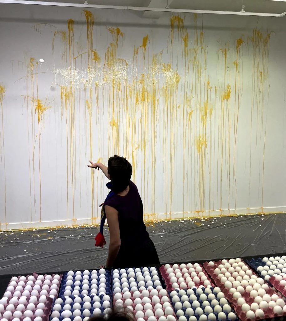 Non manca all’appello Jeff Koons: sua è la serie Cracked Egg, datata 1994-2006 e appartenente alla serie Celebration, concepita per celebrare momenti importanti nel corso dell’anno solare, attraverso immagini universali di gioia, infanzia e meraviglia: «Ero interessato al dialogo con la natura e gli aspetti dell’eterno, qui ed ora, il fisico e l’effimero, la simmetria e l’asimmetria, un senso del fertile». Anche Urs Fisher ha utilizzato l’immagine di una mano che schiaccia un uovo per la copertina di un album degli Yeah Yeah Yeahs, giocando sulla fragilità del soggetto. Non li abbiamo citati tutti, l’uovo ha davvero attraversato epoche e culture, apparendo figurativamente – Fabergé ha creato la celeberrima serie Uova Fabergé – o ispirando nella forma – Agnes Martin, per esempio, ha sperimentato forme ovali simili a uova, mentre Adelaide Cioni ha intitolato una sua mostra Ab ovo/ On Patterns dove “ab ovo” si traduce in “dall’uovo”, ed era un tentativo di approcciarsi al primato della forma – ma anche fungendo da metafora, come nel caso delle egg-stone di Thomas De Falco. Chiudiamo il nostro viaggio con Sarah Lucas, che spesso ha utilizzato uova nel suo lavoro, a volte in modo letterale, altre come simbolo di fertilità e femminilità: suo è Self Portrait with Fried Eggs (1996) e sua è la performance 1000 Eggs: For Women, con cui ha coinvolto 1000 persone, donne o chiunque si riconoscesse nel genere femminile, a lanciare una alla volta un uovo sulla parete di una galleria di Londra fino a creare un’opera astratta e temporanea.