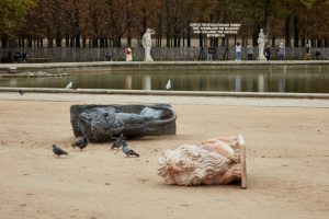Vicino all’ingresso dello storico giardino reale, dal lato della Place de la Concorde, quattro leoni che un tempo troneggiavano dappertutto come simbolo di potere sono ridotti all’orizzontalità e deposti al suolo dall’artista Nina Beier. Sui loro fianchi, sono sparsi semi che si offrono agli uccelli. L’artista ivoriano Romé Mivekannin ha inserito fra i numerosi astanti del celebre quadro di Veronese, le nozze di Cana, personaggi dalla pelle nera. La poesia luminosa di Robert Montgomery recita con luci led su PVC : “Love is the revolutionary energy that annihalates the shadows and collapses this distance between us”. Si iscrive nella tradizione recente della luce come immagine, concetto e scrittura, da Kosuth a Nauman, Lavin, e James Turrell citato dall’artista. Judith Hopf rappresenta la relazione fra un uomo comune e l’iPhone in una scultura di cemento con voluti richiami, nel viso e nella mano, allo stile brancusiano. Le ditate che ricoprono la statua ad altezza d’uomo alludono alla lavorazione dell’argilla.