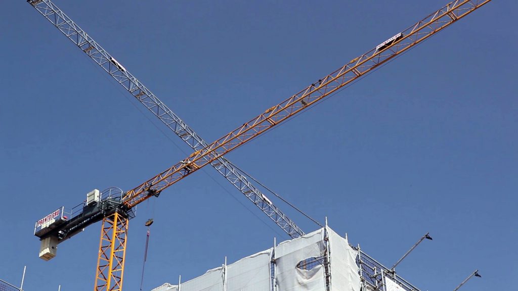 Le inquadrature dal taglio fotografico giocano con queste imponenti macchine creando assi e direttrici che dividono lo spazio visivo in quadranti netti e geometrici in un’apparente immobilità che fa assomigliare il video ad un susseguirsi di fermo immagine. Sono i movimenti impercettibili dei rami, il passaggio di una nuvola, la bandiera e il telo strappato di un’impalcatura che si muove con il vento a svelare la realtà, ricordandoci che c’è vita e c’è movimento in queste immagini e in un contesto solo apparentemente fermo.