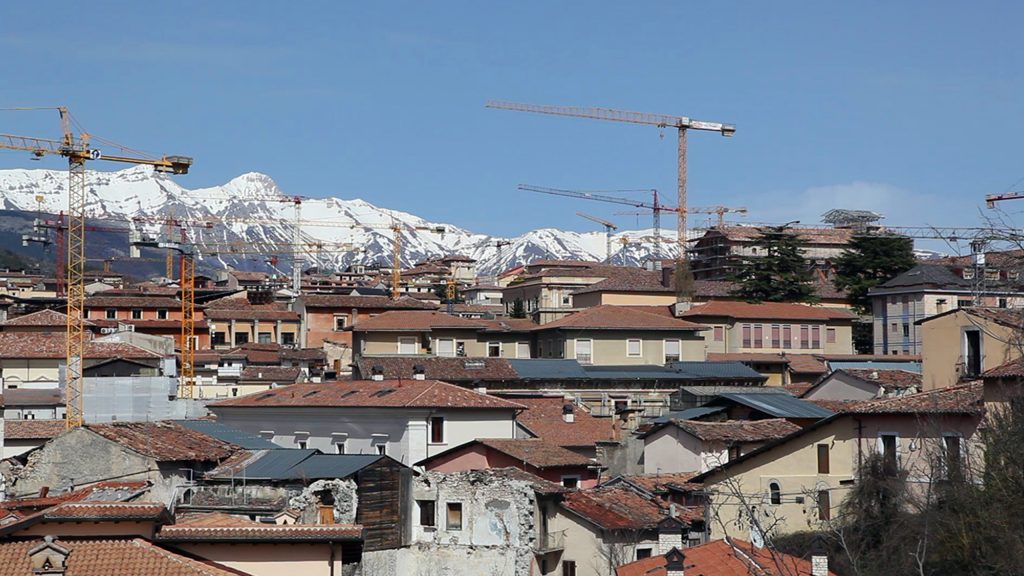 Strade e scorci apparentemente anonimi diventano progressivamente lo skyline di una città che riconosciamo, ma che viene apertamente dichiarata solo a fine video nell’inquadratura in cui campeggia la scritta “l’Aquila rinasce”. Slogan che è allo stesso tempo grido di speranza e di rabbia per una città, e un intero territorio, feriti dal terremoto del lontano 2009 e che, a oggi, sono cristallizzati in una situazione di immobilità. Un luogo che Sonia Andresano ci permette di riconoscere, non attraverso gli edifici aulici e monumentali (le tante chiese a facciata quadrata, il castello), ma tramite architetture quotidiane e, soprattutto, tramite le gru da cui prende spunto il gioco di parole nel titolo. Simbolo di ricostruzione che negli anni, qui, sono entrate a far parte del paesaggio urbano; custodi inconsapevoli del tempo che passa.