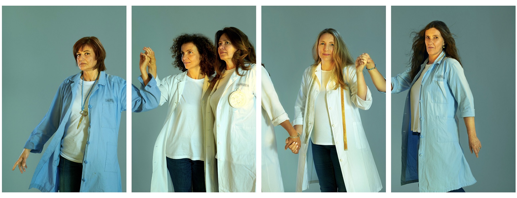 Le lavoratrici fotografate, eleganti e fluide, aggraziate e scultoree in pose neoclassiche, si muovono in uno spazio in movimento, che dialoga con il pubblico e con le singole stampe di dimensioni ridotte, icone intime e liriche, esposte su pannelli a rappresentare sei ritratti allegorici che esprimono individualità e unicità del singolo che diventa collettività nella lotta femminista. Tra esse spicca l’icona simbolo della mostra, Ritratto di Pierangela, una donna chiamata Piera, sul capo un pizzo de La Perla, richiamo alla sacralità e alla femminilità, un volto nascosto ma presente, immagine così potente da aver vinto un premio internazionale Female in Focus promosso da British Journal of Photography in collaborazione con Nikon, per celebrare il talento e la creatività delle fotografe di tutto il mondo.