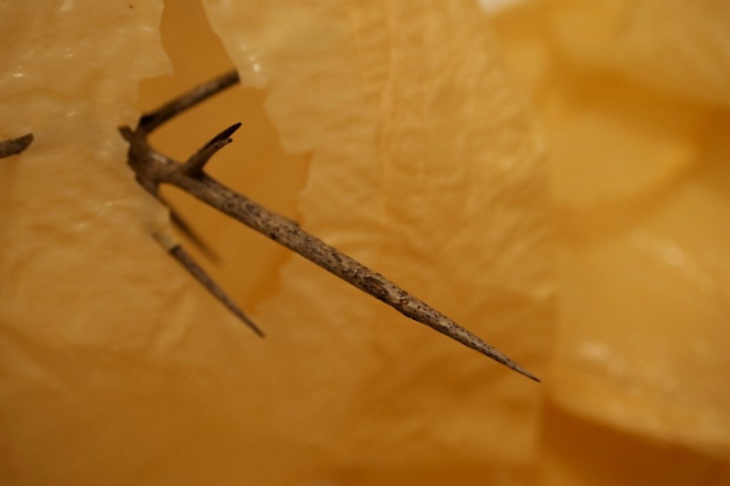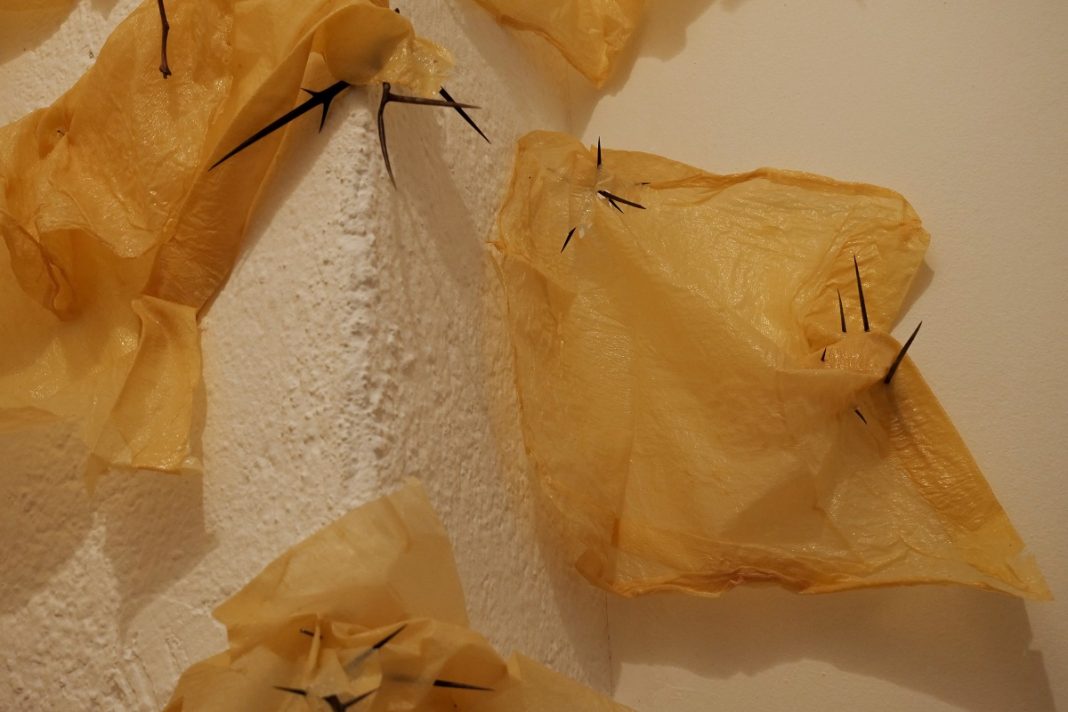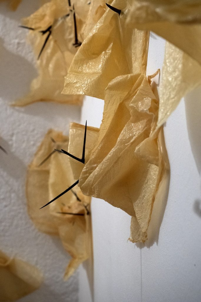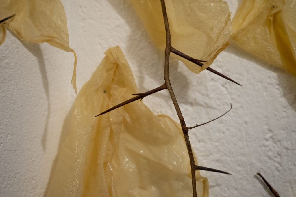 “Sottile instabilità” è composta dunque da piccole armi, le spine, che trafiggono la pelle ruvida dei fogli di soia, come se penetrassero dall’esterno all’interno di AnonimaKunsthalle, attraverso la pelle dello spazio accedono al suo interno in maniera aggressiva e irriverente, ma pur sempre aggraziata ed elegante, come spesso accade in natura – non sono forse le rose, con tutte le loro spine, i fiori più noti, iconici e imitati? – esse pungono ma la loro leggiadria arriva ad affascinare i più. Allo stesso modo le spine di acacia, installate a Varese, mettono a rischio la visita dello spettatore, il quale però è al contempo attratto e ammaliato dall’atto tanto violento.