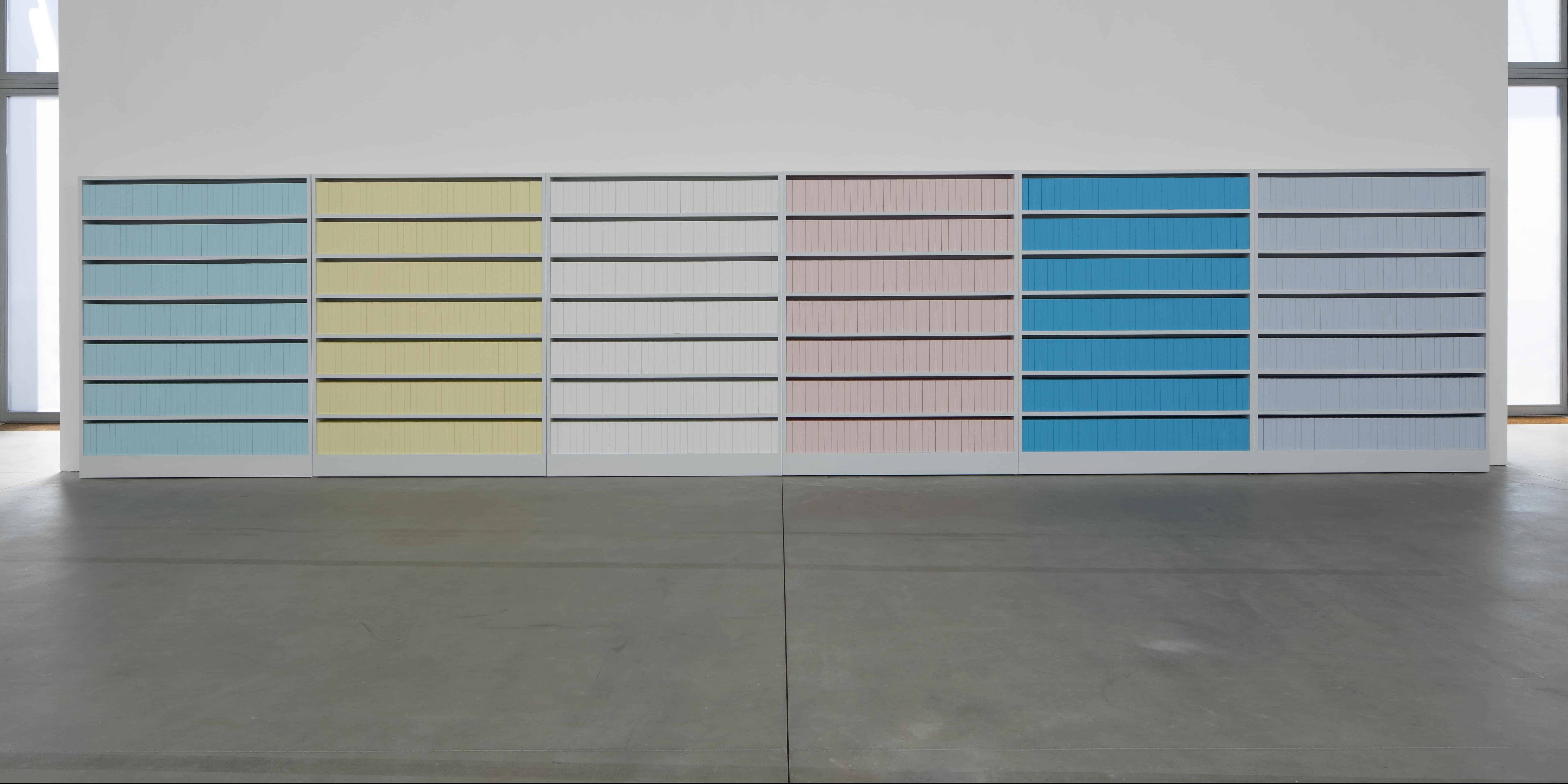 Al secondo piano della galleria (consigliamo di prendere l’ascesa verso l’alto attraverso le scale esterne dell’edificio per godere di uno spaccato di Milano vista da “dentro” il cuore della periferia degno di nota), metaforicamente si arriva in Paradiso, con l’opera Libreria (2018), quasi un testamento poetico, presentata in occasione della sua ultima personale al Nouveau Musée National de Monaco, nel Principato di Monaco, per certi versi ancora inedita poiché sviluppata da Spalletti, dopo la mostra monegasca. Questa installazione ambientale comprende quasi 1500 libri allineati sugli scaffali di una sequenza di librerie. Le pagine dei libri non sono stampate, ma “volumi” monocromi di carta velina. Scrive Spalletti “cerco di trovare nella carta una sensazione tattile che appartiene al mio lavoro, per questo ho usato carta velina”.