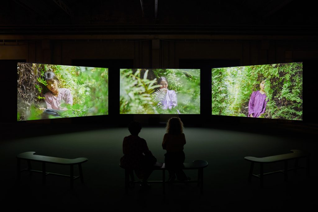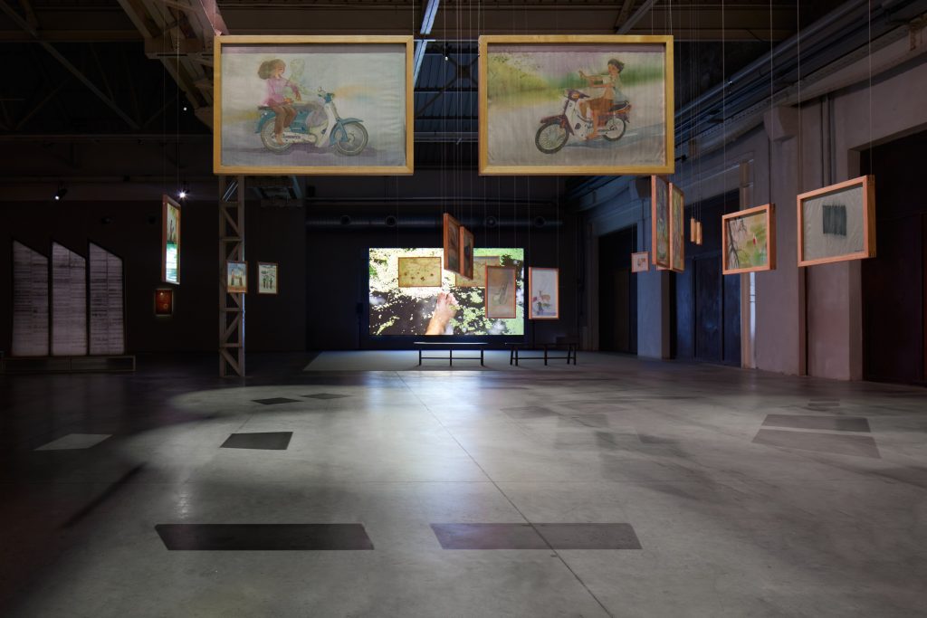 Reincarnation of Shadows: il titolo della mostra riflette la volontà di Thao Nguyen Phan di interrogarsi sulla possibilità che i miti tramandati oralmente, rimasti nell’ombra, si reincarnino ciclicamente. La denuncia che l’artista intende muovere è rivolta alle verità storiche che riguardano il passato del Vietnam, occultate dai racconti ufficiali. «Aspiro a costruire un corpus di opere interconnesse tra loro, in cui la diversità di stili e materiali possa coesistere in una dimensione onirica di democratica utopia» spiega Thao Nguyen Phan. La presenza di elementi ricorrenti nelle opere rende l’esperienza di visita immersiva e culla lo spettatore in un percorso fiabesco e familiare. Uno dei leitmotiv è il fiume Mekong, fonte di nutrimento e collegamento per i cittadini del Sud-Est asiatico. Per l’artista il corso d’acqua raffigura l’emblema dell’abissale cambiamento introdotto dal colonialismo e dall’eccessivo sfruttamento del suolo e delle risorse naturali. Il fiume ritorna quasi ossessivamente nelle opere in mostra. Nel video a tre canali First Rain, Brise Soleil vengono raccontate, in chiave romanzata, alcune delle vicende legate ai miti collettivi di Cambogia e Vietnam. Partendo dalle leggende popolari e dalla memoria storica, Thao Nguyen Phan sviluppa un’arte universale che riesce ad abbracciare tematiche attuali: urgenza ambientale, colonialismo e industrializzazione. Nella visione dell’artista, è importante che l’uomo tenti di costruire e intessere una profonda relazione che lo leghi al paesaggio, passando attraverso la percezione e la serenità che l’esperienza della natura infonde.
