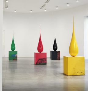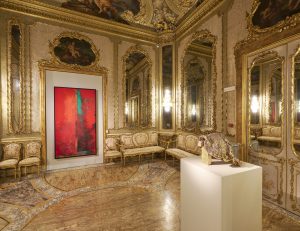 Una sofisticata introduzione alle opere presenti nel salone ovale della galleria: si tratta di sei grandi DROPS, gocce monocromatiche in vetroresina poggiate su piedistalli in formica e concepite come monumenti al sangue, all’urina, all’acqua, al carbone, al petrolio e alla flora. Su ogni base, dello stesso colore lucido e brillante della goccia, Ruby ha iscritto le iniziali del tributo con un stile che ricorda i graffiti urbani, quasi ad inserire una nota stonata nella perfezione formale e cromatica dell’opera. La seconda sede della mostra è ancora più sorprendente: la sala della Toletta di Venere all’interno della Galleria Doria Pamphilj, aperta per l’occasione. Un ambiente intimo e prezioso, rivestito di stucchi affreschi e specchi, dove l’artista ha collocato due opere, che dialogano attraverso colori e materiali diversi con l’atmosfera rarefatta del boudoir settecentesco. La prima è WIDW CRASH CULTURE (2021), un dipinto rosso e verde della serie delle finestre (windows) , collocato in corrispondenza della porta d’ingresso, che conferisce una nota di vivace energia cromatica all’aulico e preziosa ambiente. La seconda, BONNET (7483) (2020) è una scultura in ceramica dorata ispirata alla forma di un berretto rinascimentale, come un oggetto dimenticato da una dama alla fine di una festa. Degna conclusione di una mostra da non perdere, che dimostra come Roma possa costituire ancora oggi, come già nel Settecento, una fonte di ispirazione non banale per gli artisti contemporanei d’oltreoceano.