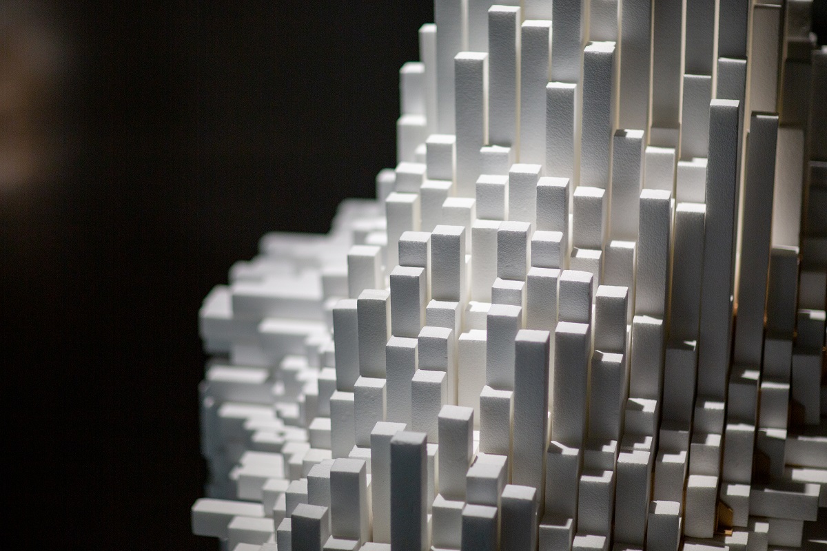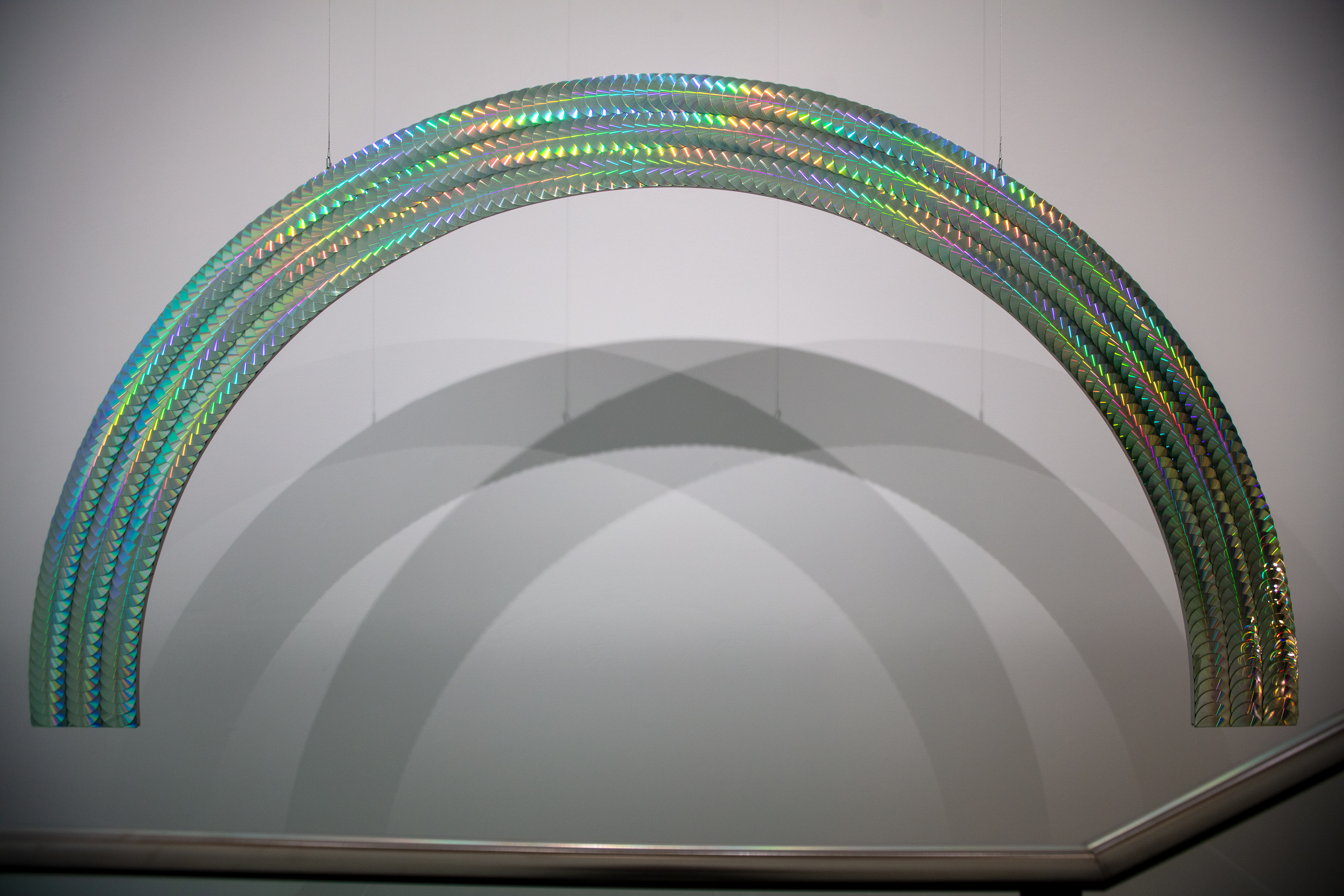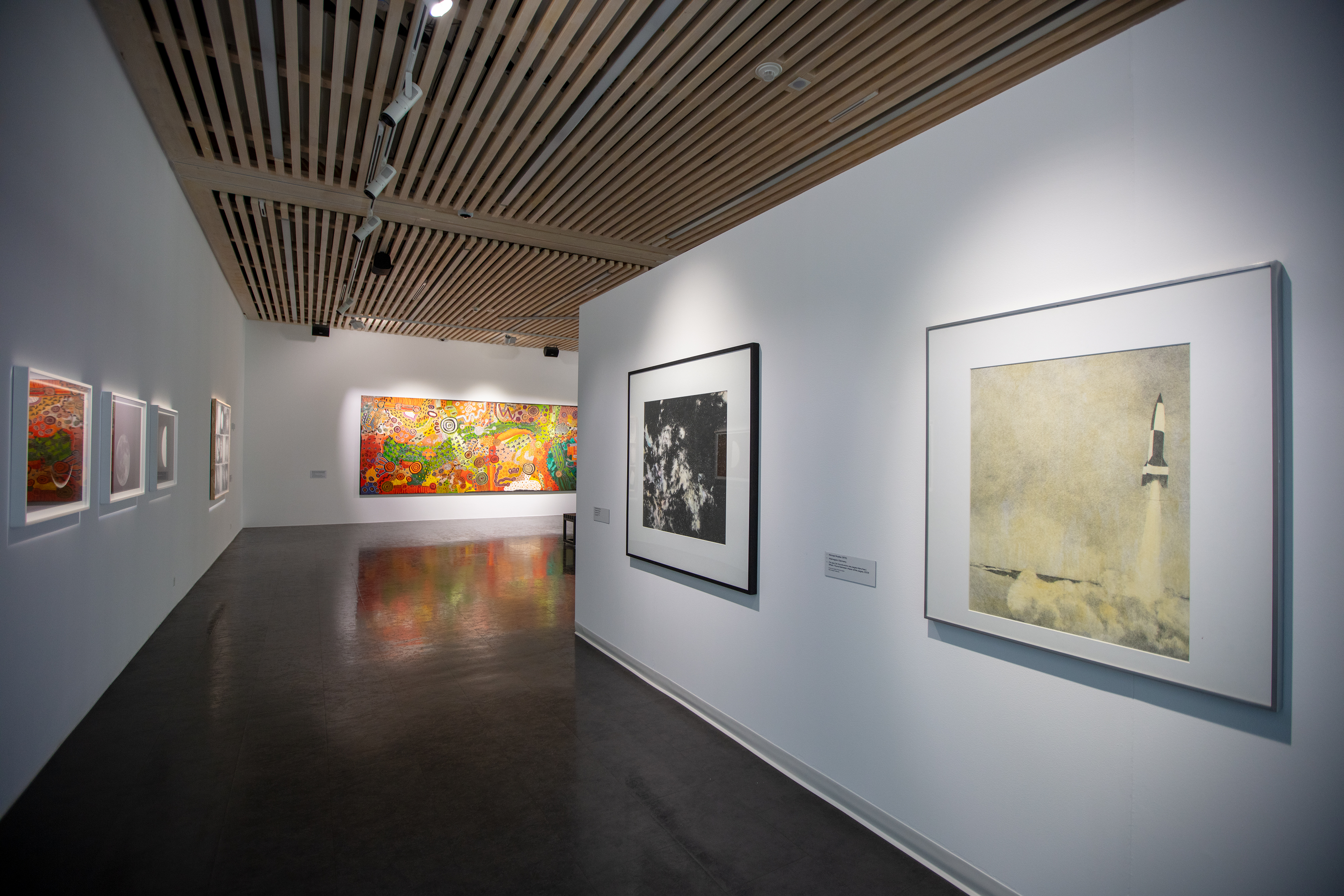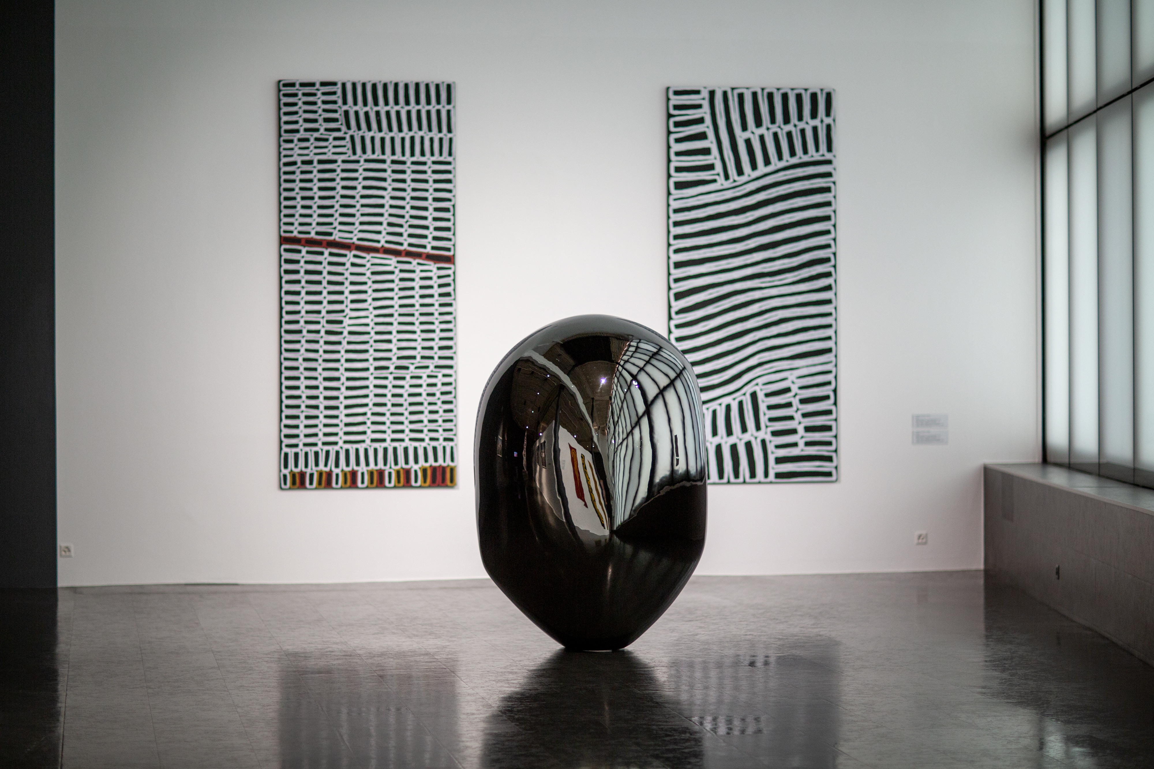 Il team curatoriale nel piazzare le opere ha creato interazioni spontanee e inedite, come tra Flatsun (2011) di Rafael Lozano-Hemmer e Polkaurululga (2002) di Ronnie Tjampitjinpa, noto rappresentante della pittura astratta australiana. La composizione dell’artista messicano rappresenta un falso sole di un diametro di 140 cm – un miliardo di volte più piccolo del sole -, 60mila luci LED rosse e gialle e una fotocamera. Questo display circolare reagisce alla presenza degli spettatori con perturbazioni e attività, in assenza di movimenti il dispositivo si spegne. Polkaurululga è un invito alla contemplazione con i suoi cerchi concentrici – che vanno dal giallo all’arancione – che oscillano in uno spazio geometrico che infonde energia vitale. Attaccato alla tradizione e alla sua regione, le creazioni di Tjampitjinpa rimandano ai rituali di iniziazione dei Tingari, figure ancestrali della mitologia aborigena. Le sue opere sono nelle collezioni del Musée du Quai Branly a Parigi e del Musée des Confluences di Lione.