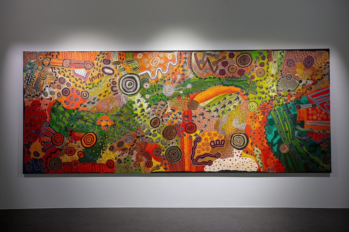 La produzione aborigena, spesso collettiva, gioca con prospettive diverse come quella frontale o a volo d’uccello. A mo’ di carta geografica il visitatore ripercorre linee e chiazze di colori uniformi che rimandano alla terra, al deserto, alle fonti d’acqua come agli spostamenti di animali e di persone. Creation Stories that belong to Kanpi (2021) è un magnifico esempio di composizione collettiva realizzata da dodici donne, tra cui Kaye Baker (1955), Teresa Bake (1977), Beryl Jimmy (1970-2022), Kani Patricia Tunkin (1981), Janice Woods, e Vianita Woods (1990). Un tipo di prospettiva che rimanda alla posizione degli artisti che si accomodano sul supporto cantando e dipingendo le gesta di eroi del Dreamtime, il periodo in cui gli antenati hanno costruito la natura, le tradizione e i rituali.