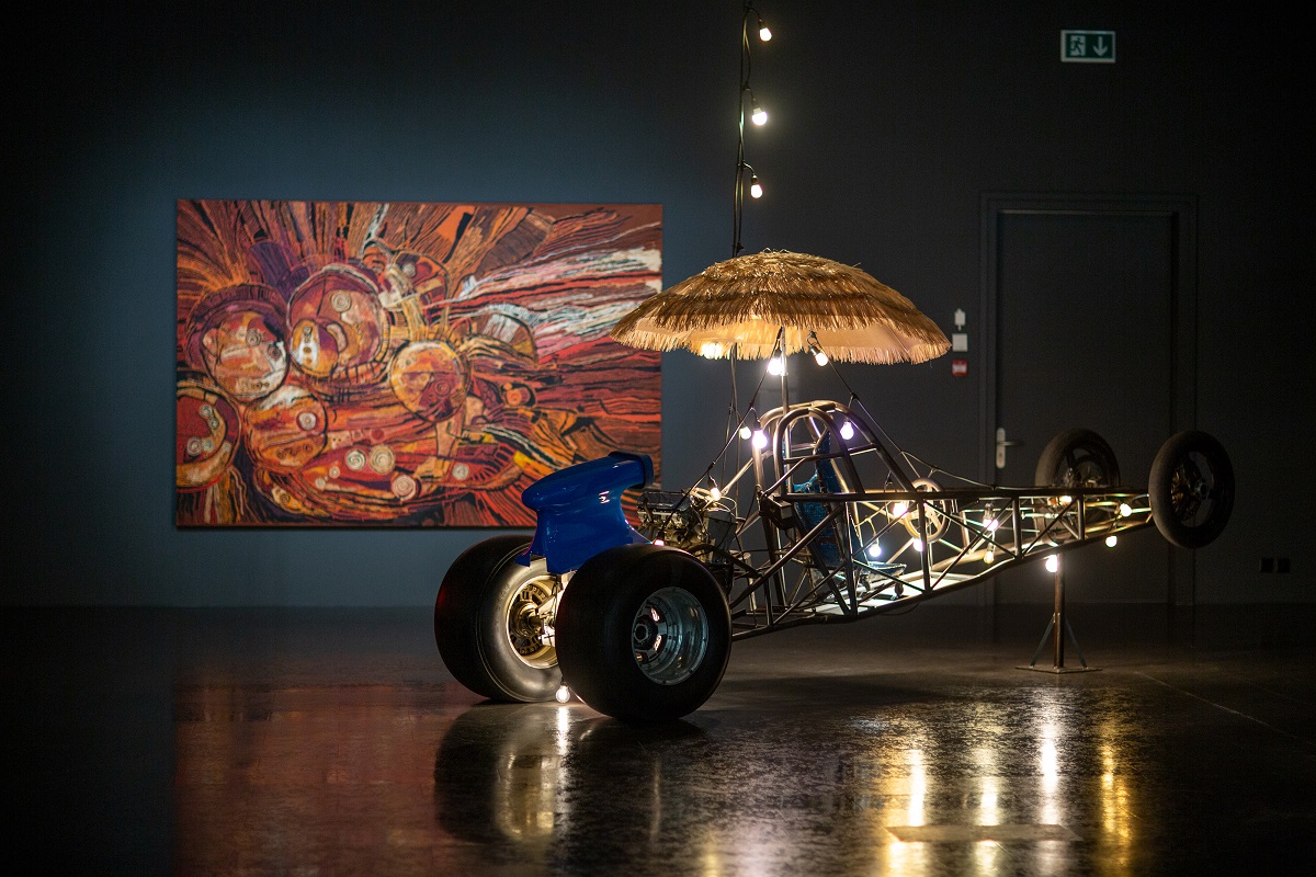 Nelle culture aborigene e degli isolani dello Stretto di Torres, tutto sulla terra si riflette nel cielo. Vedi Milŋiyawuy River of Stars 17 (pittura su corteccia, 2022) di Naminapu Maymuru-White (1952), una versione astrale dell’omonimo fiume, clin d’œil alla via lattea. Un’esecuzione che amplifica la percezione dello spazio fisico e che ritroveremo riprodotta sul soffitto dell’auditorium della Fondazione Opale, di prossima apertura. Nata in una famiglia di artisti riconosciuti, Naminapu Maymuru White è stata una delle prime donne a cui è stato insegnato a disegnare. Presente anche la serie fotografica Fake di Michael Cook, che ritrae il viaggio di una coppia aborigena e del loro figlio adottivo nel deserto dell’Australia centrale. La serie, che inverte la biografia dell’artista, ritrae una famiglia con vestiti e oggetti di lusso che scarta a mano a mano che si immerge nel paesaggio ancestrale.