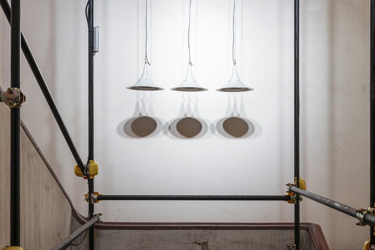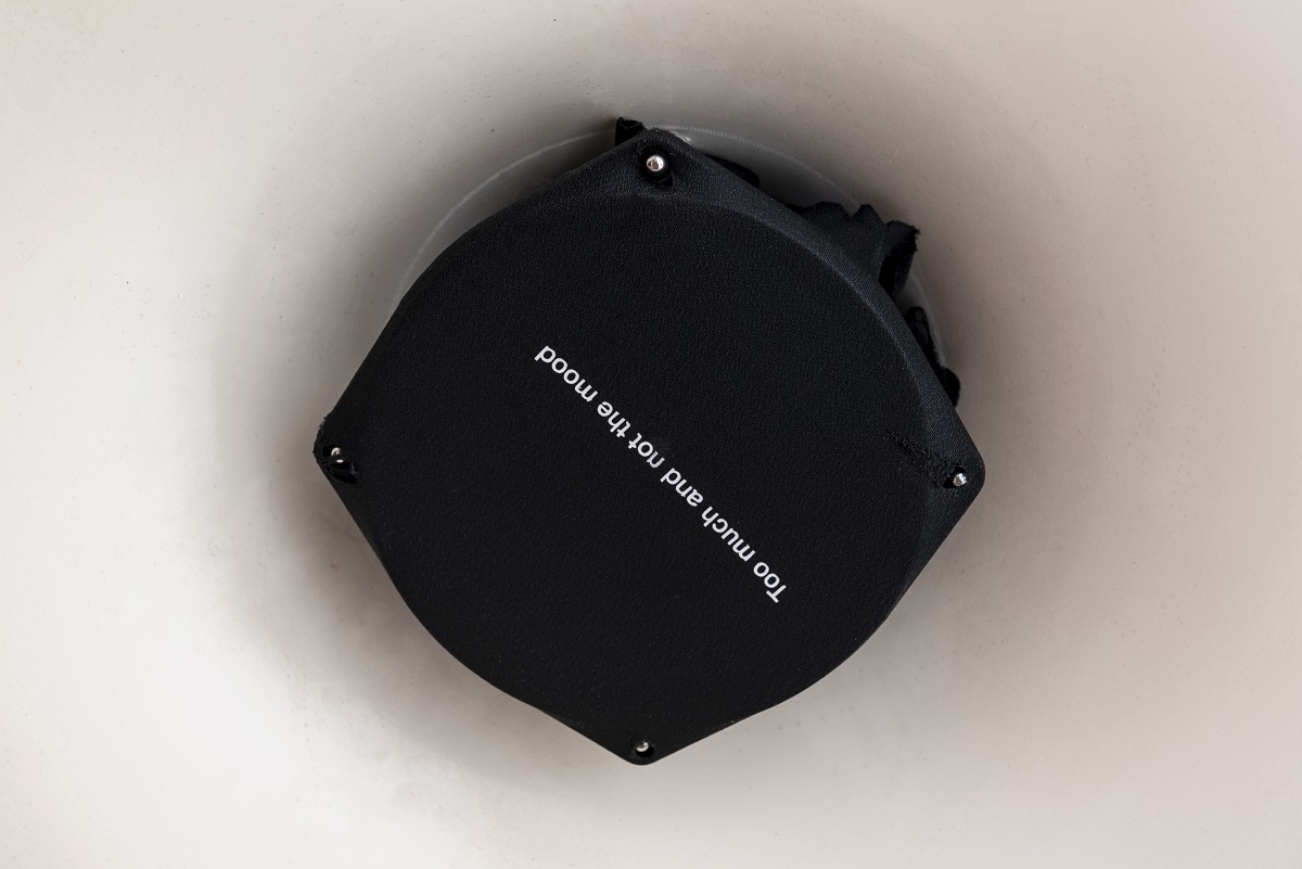 Sono queste le premesse di Specchio riflesso, opera installativa dell’artista Lorenzo Lunghi che si struttura come un forno solare autonomo ma privato della sua funzione d’origine. Insieme alla scultura rimangono poi le tracce di un accampamento, uno spazio lontano dalle logiche di profitto della società neoliberale e al contempo una visione utopica di vita individuale. Mentre la società di Lunghi è inattuabile perché privata del capitale e della parte più conviviale, quella di Davide Sgambaro si allontana dalle dinamiche iper-performative e iper-produttive del mondo lavorativo per esaltare il riposo e la stasi. Così le tre casse di Too much and not the mood (choosy), un tempo usate nell’ex fabbrica di Manifattura per scandire i ritmi lavorativi, riproducono ora un sospiro alterato dall’elio: una traccia di un passato contro cui l’artista si ribella prendendosene gioco.