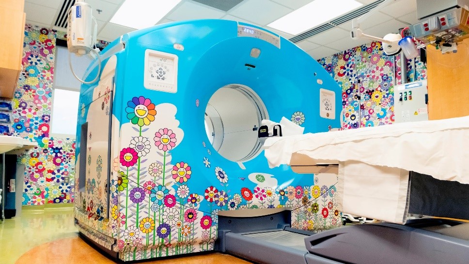 Più recente è invece la notizia dell’intervento di Murakami per un ospedale pediatrico di Washington: si tratta del Children’s National Hospital, uno tra i più importanti ospedali pediatrici degli Stati Uniti. Così, nella sala adibita agli esami diagnostici da effettuarsi attraverso un macchinario per la TAC, è avvenuta un’esplosione di colori in perfetto stile Superflat. Centinaia e centinaia di fiori sorridenti dai petali di ogni colore riempiono le pareti della stanza e l’apparecchiatura per le diagnosi. Quello che prima era uno spazio asettico, freddo e triste ora ha acquisito un tono decisamente più empatico e un’atmosfera accogliente, grazie all’operazione artistica di Murakami che l’ha riempito di sorrisi. I numerosi e giovanissimi pazienti che ogni anno vengono seguiti nel Children’s National Hospital avranno la possibilità di vivere in maniera allegra un’esperienza che solitamente è collegata a sensazioni ed emozioni negative.