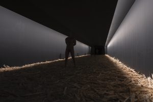 La stanza del pianto è stata originariamente presentata nella Turbine Hall della Tate Modern di Londra nel 2018. Prima di entrare si viene timbrati con un numero che indica tutte quelle persone che hanno attraversato il Mediterraneo quest’anno, comprese coloro che hanno perso la vita nel farlo. Il numero viene aggiornato quotidianamente. La stanza è algida ed è vuota, se non fosse per alcune fessure nelle pareti che rilasciano un composto organico al mentolo che induce alla lacrimazione. La luce è potente. L’artista parla di “empatia forzata” perché, in quel luogo quasi clinico, ci troviamo a condividere con perfetti sconosciuti uno spazio “intimo”, quello del pianto. Per lo spettatore frettoloso sarà solo una boccata di fresco, di odore di menta inebriante. Per chi decide di sostare, di prendersi più tempo, si troverà a confrontarsi con il pianto, seppur indotto, e condividerlo con altri. Quello che probabilmente faremmo se solo ci soffermassimo ad osservare più a lungo un’immagine straziante di un giovane migrante morto nelle acque del Mediterraneo o di chiunque si trovi a vivere in una dimensione di dolore, sofferenza o privazione di libertà.