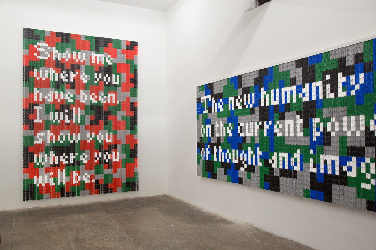 Nei nostri lavori, tecnologie all’avanguardia e strumenti tradizionali si incontrano per generare diverse chiavi di lettura nello spettatore tentando di coinvolgerlo attivamente dal punto di vista fisico e psicologico. In questo caso, la mostra è intesa come un percorso che suggerisce al fruitore di muoversi nello spazio per vivere l’incontro con l’opera su più livelli: formali, contenutistici e interpretativi. Lo spazio è studiato per avvicinarsi e allontanarsi dalle opere per cogliere nel primo caso le caratteristiche materiche, cromatiche e astratte delle opere, e nel secondo caso la componente testuale e formale. Nello spazio, inoltre, abbiamo installato alcuni ventilatori che fanno danzare e “suonare” le opere. Il pubblico, quindi, può riflettere anche su questa ulteriore caratteristica e osservare il loro movimento».