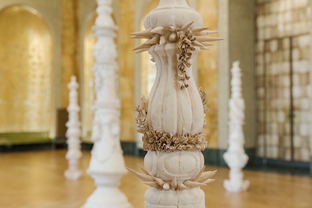 Una location storica, quella del Salone delle Feste dell’Hotel Principi di Piemonte, fa da cornice alle opere di Diego Cibelli, Obelischi e Totem popolano gli spazi e propongono una sintesi dei valori fondamentali del suo creare. Il progetto espositivo curato dall’artista e dalla Galleria Alfonso Artiaco di Napoli, in collaborazione con Artissima e UNA Esperienze, si presenta come un progetto emblematico nella ricerca dell’artista. Materiali, storia, tecniche, tutto viene collegato con un gioco sapiente di rimandi, dove passato, presente e futuro convivono insieme.