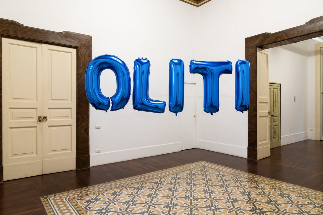 Nella sala successiva, un’ulteriore sperimentazione linguistica si configura formalmente in una installazione di palloncini che compongono la parola OLITI. A chiusura del percorso e del progetto, nell’ultima sala, un kit composto da un sacchetto a chiusura ermetica in cui sono raccolti una mappa con le istruzioni per costruire l’isola, il dizionario che racchiude l’elenco delle parole elaborate durante la sperimentazione, un gessetto per disegnare l’isola e un poster su cui si legge la frase “Il gioco è in possesso della significanza”.