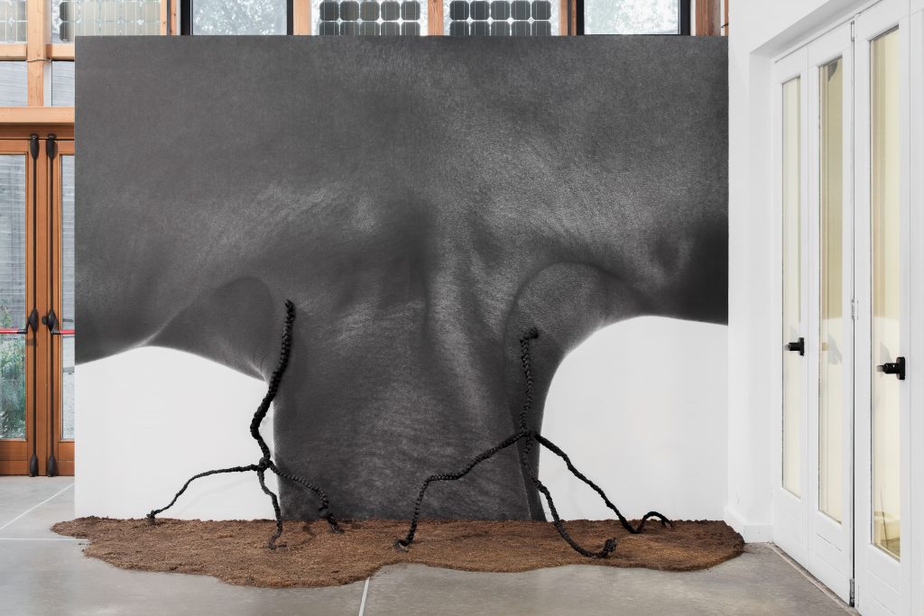 «Ho costruito il mio bagaglio simbolico a partire da materiali organici come la terra per arrivare a elementi artificiali come i capelli sintetici utilizzati per le extension. Il capello ha sempre fatto parte della mia vita in quanto donna nera, una parte del corpo attraverso la quale posso sfogarmi, nascondere le mie paure», racconta Diaw. «La pratica dell’intreccio femminile nelle comunità africane durante il periodo delle piantagioni è infatti un atto simbolico oltre che estetico. Molte donne reinterpretarono i codici tradizionali delle acconciature trasformando le loro capigliature in mappe segrete, rappresentazioni criptiche dei percorsi utilizzati dagli schiavi per la fuga. Le trecce potevano custodire anche semi provenienti dalla terra natale, nascosti come simboli di e speranza».